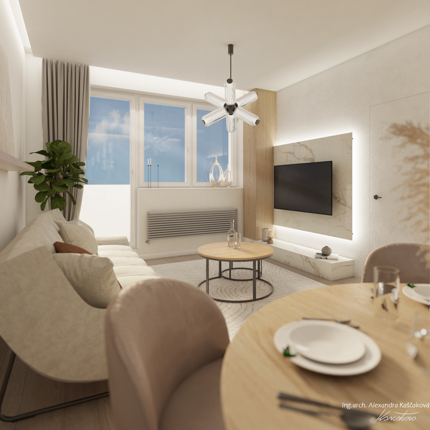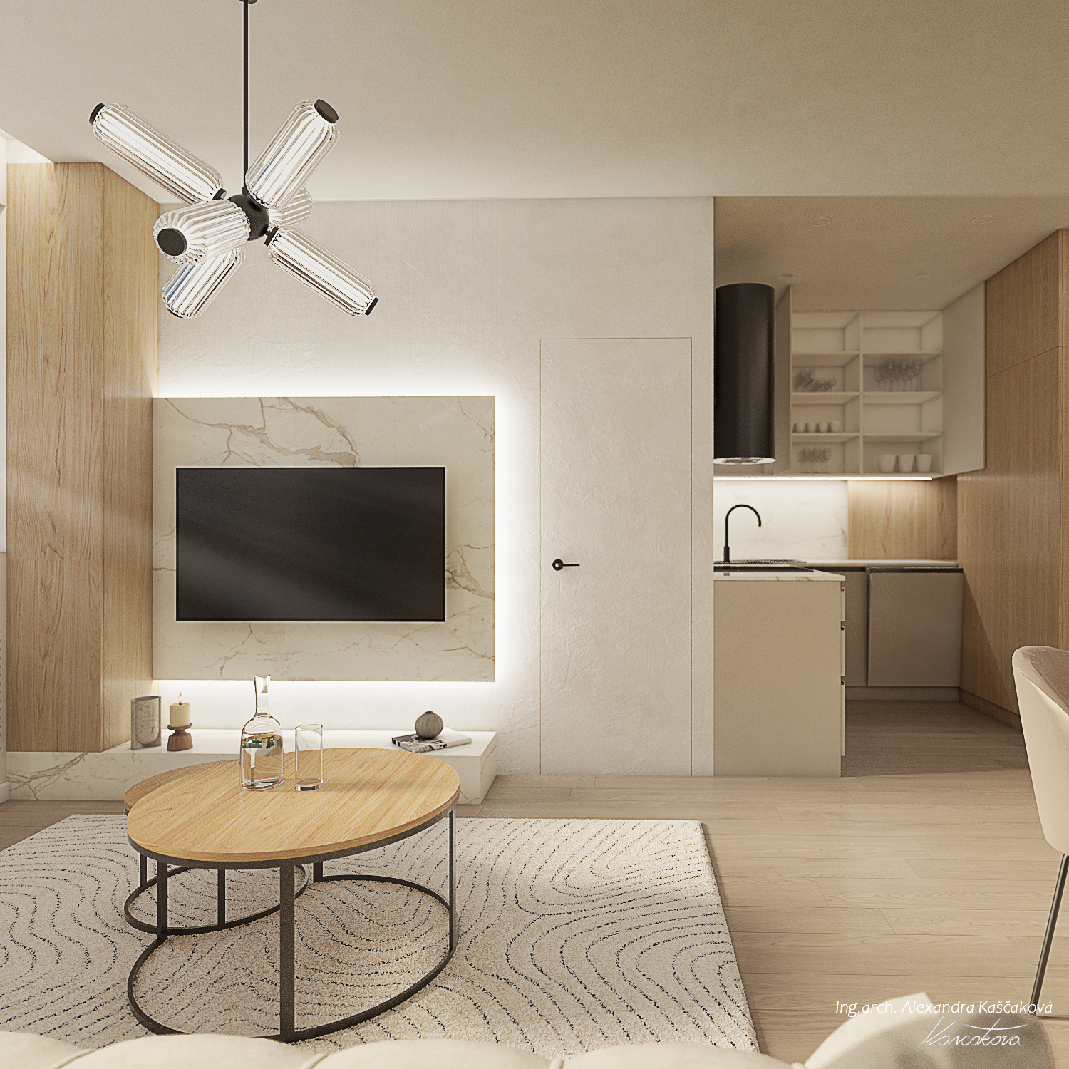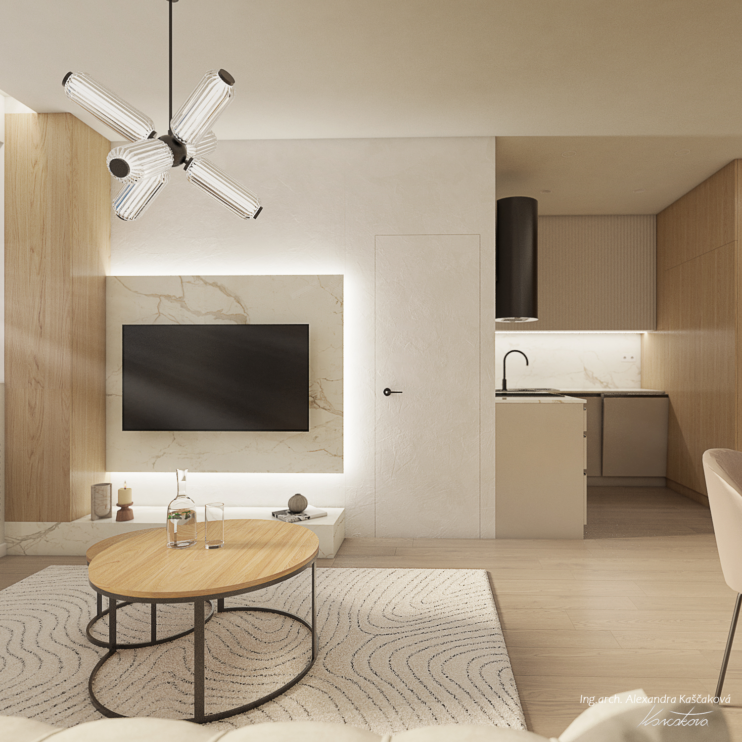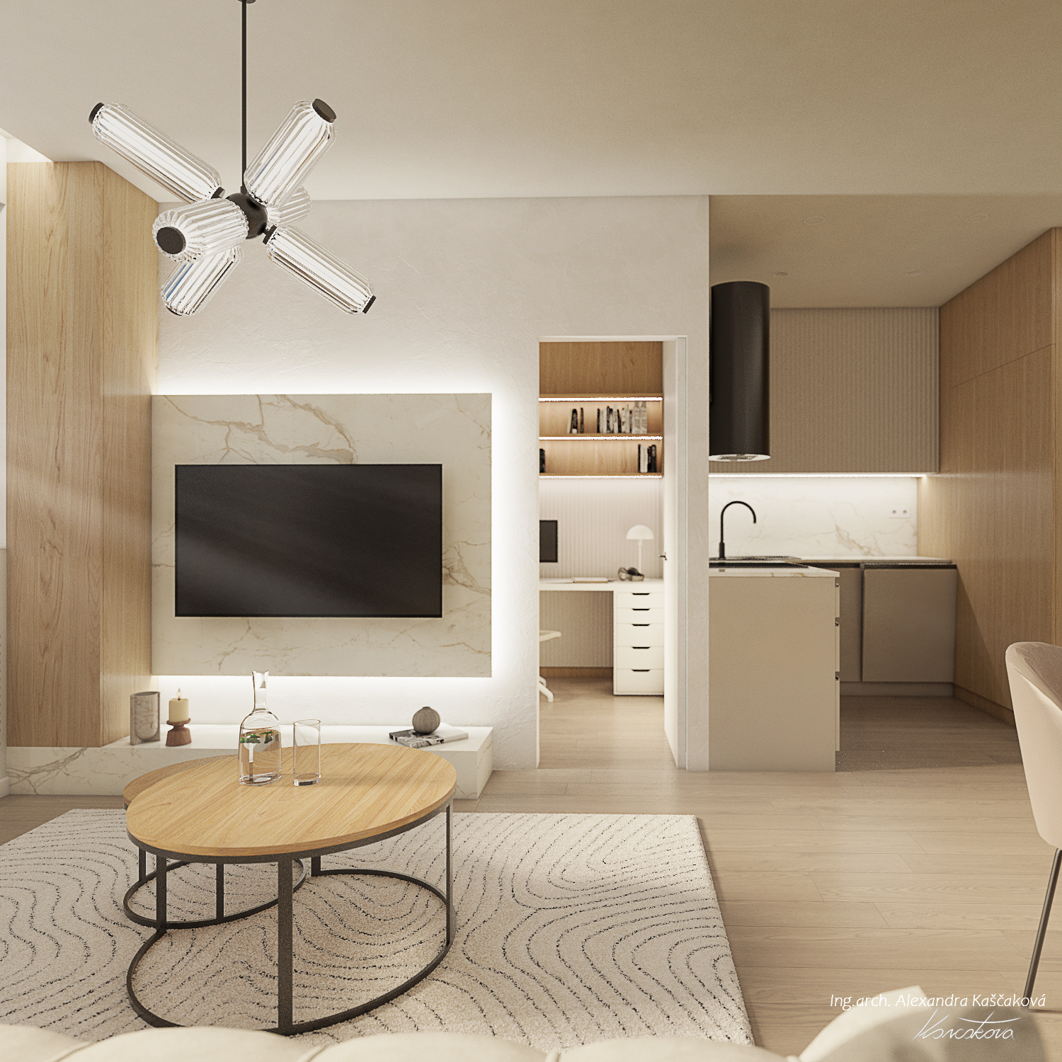Zadáním klienta byla kompletní rekonstrukce bytu včetně změny dispozice pro vytvoření dalšího pokoje, např. pracovny nebo menšího dětského pokoje. Kuchyň jsme proto spojili s obývacím prostorem a umístili ji do zálivu vedle nově navrženého pokoje. Nově vzniklýí prostor jsme se rozhodli schovat za dveře v dekoru stěrky, která plynule pokračuje do obývacího prostoru. Byt jsme ladili do světlých barev, dominuje kombinace bílé, béžové a dubového dřevodekoru. Toto barevné schéma vytváří velmi klidnou a harmonickou atmosféru. Na vytvoření jemného kontrastu jsme použili černou barvu, která se objevuje pouze jako doplňková barva na kování, nohách sedacího nábytku, prosklených posuvných dveří či osvětlení. Osvětlení jsme mimo jiné řešili i v rámci podhledů a LED pásků, které jsme umístili za zrcadla, či pod poličky. Trochu elegance jsme do prostoru přinesli mramorovými obklady, které dominují v koupelně, ale také jsme je použili jako vystupující prvek za televizí.