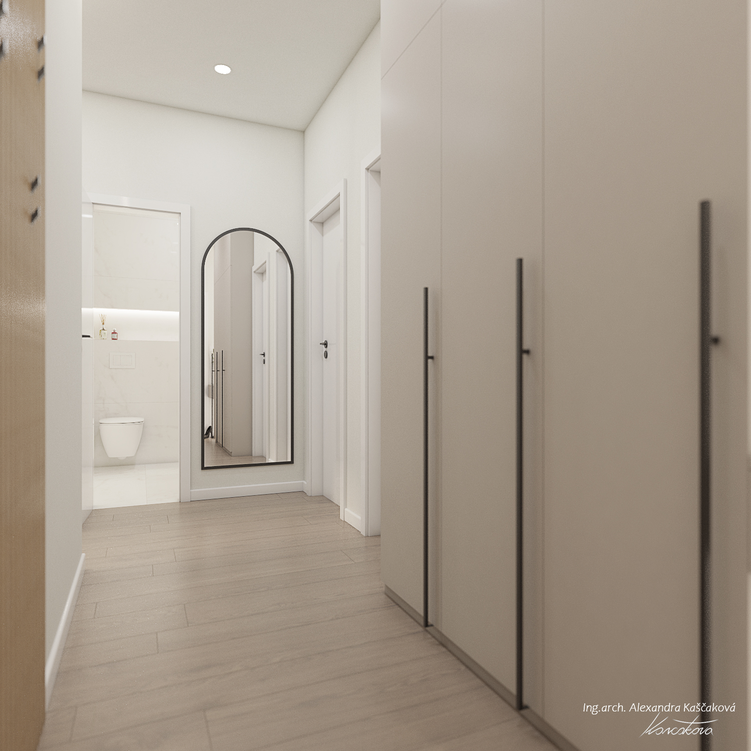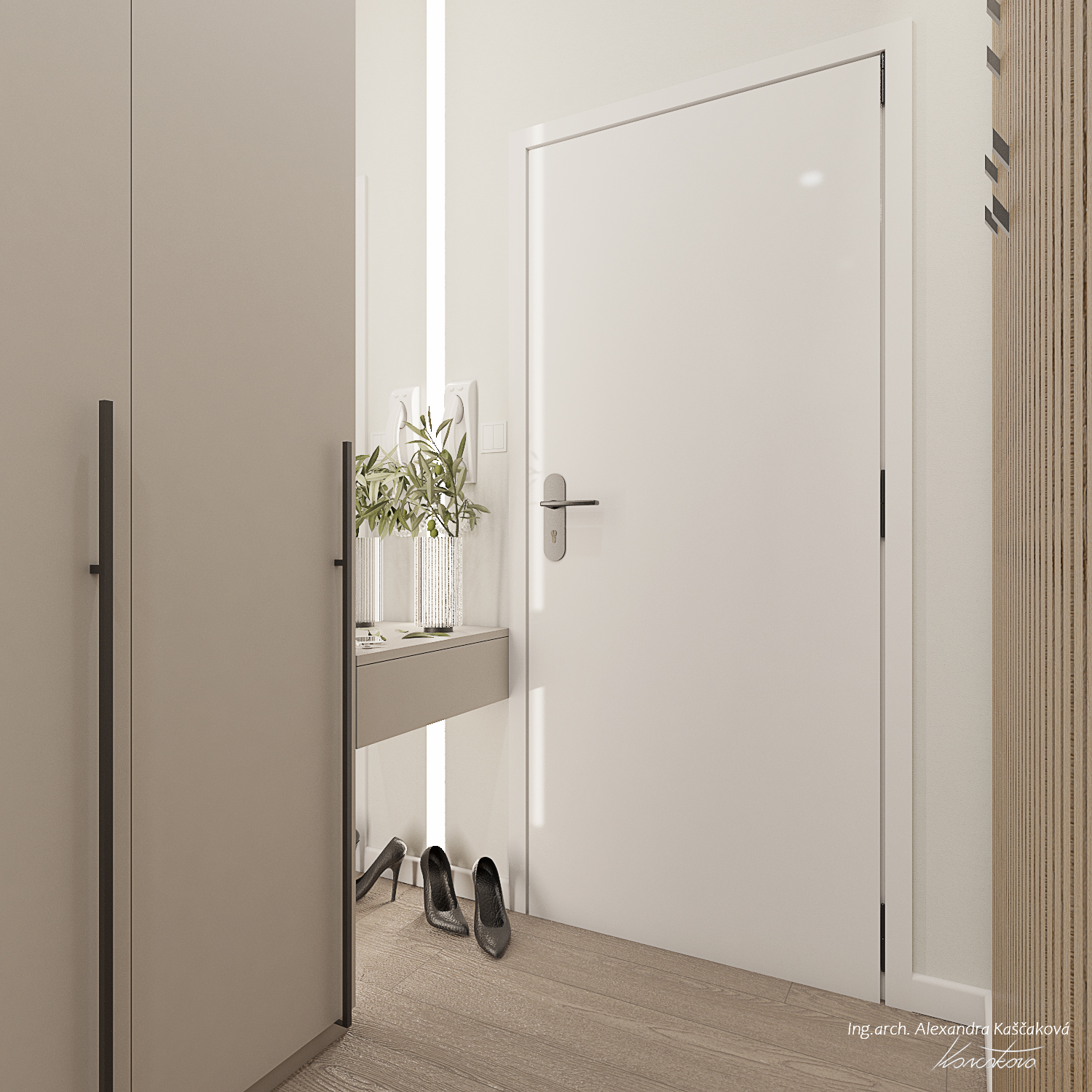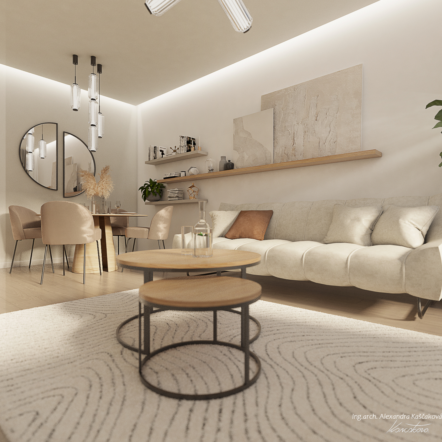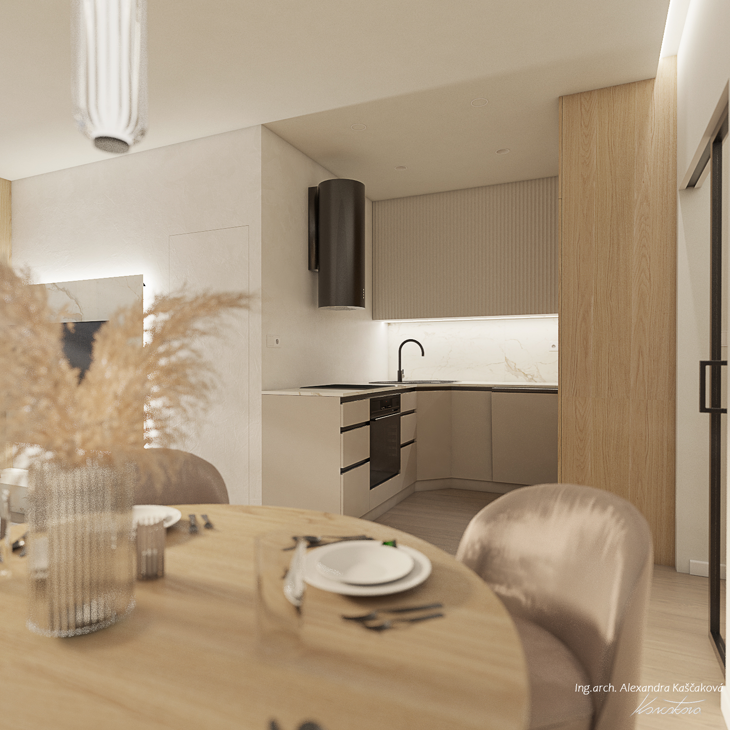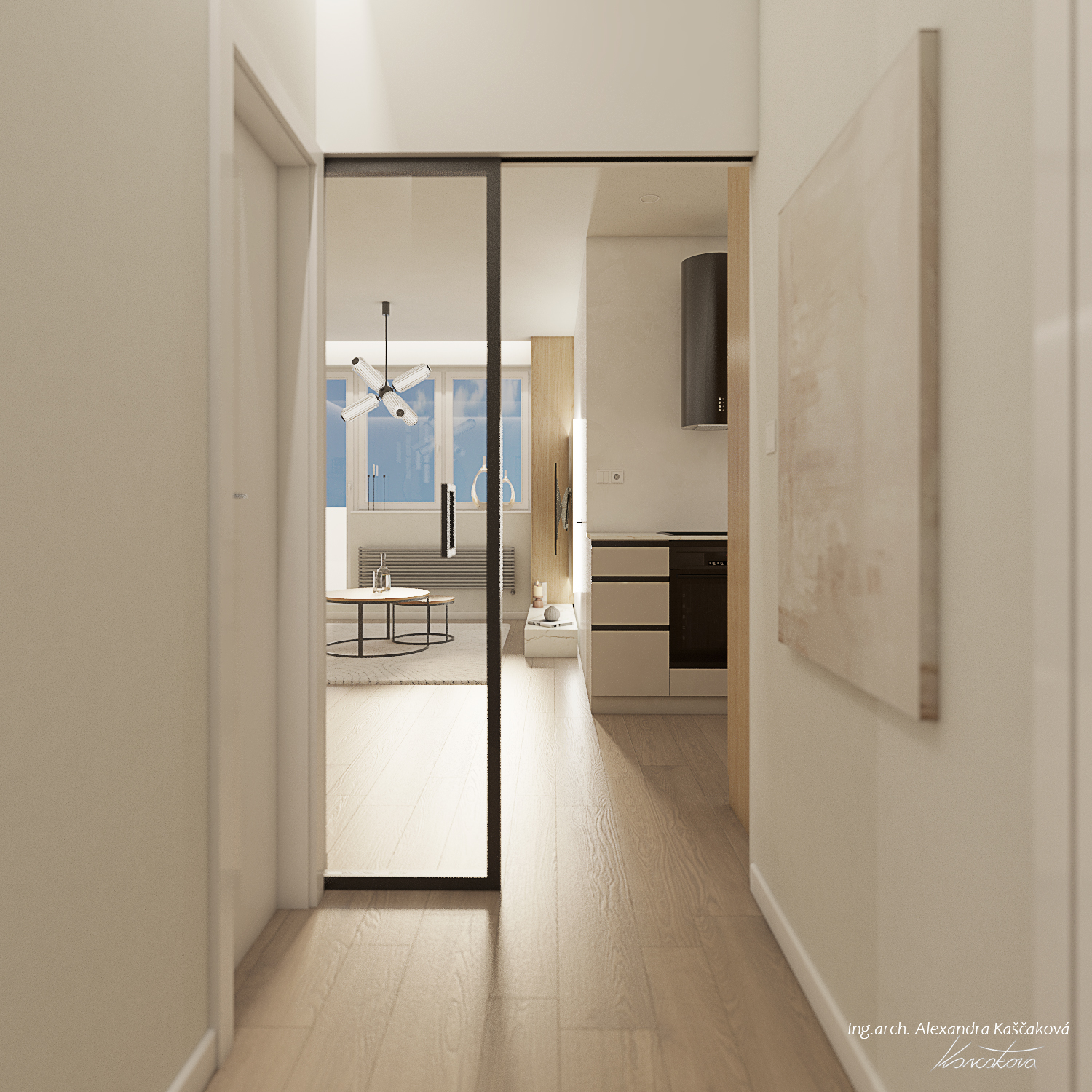 Zadáním klienta byla kompletní rekonstrukce bytu včetně změny dispozice pro vytvoření dalšího pokoje, např. pracovny nebo menšího dětského pokoje. Kuchyň jsme proto spojili s obývacím prostorem a umístili ji do zálivu vedle nově navrženého pokoje. Nově vzniklýí prostor jsme se rozhodli schovat za dveře v dekoru stěrky, která plynule pokračuje do obývacího prostoru. Byt jsme ladili do světlých barev, dominuje kombinace bílé, béžové a dubového dřevodekoru. Toto barevné schéma vytváří velmi klidnou a harmonickou atmosféru. Na vytvoření jemného kontrastu jsme použili černou barvu, která se objevuje pouze jako doplňková barva na kování, nohách sedacího nábytku, prosklených posuvných dveří či osvětlení. Osvětlení jsme mimo jiné řešili i v rámci podhledů a LED pásků, které jsme umístili za zrcadla, či pod poličky. Trochu elegance jsme do prostoru přinesli mramorovými obklady, které dominují v koupelně, ale také jsme je použili jako vystupující prvek za televizí.