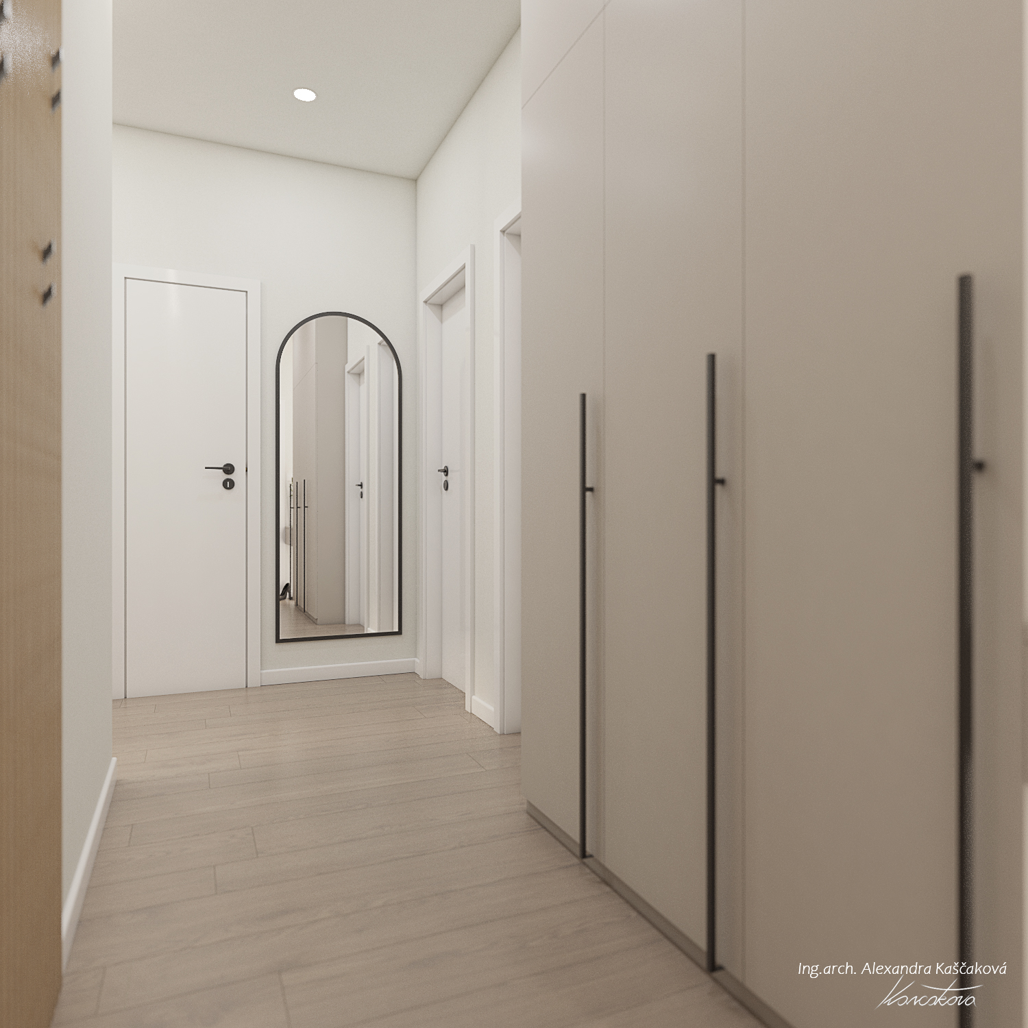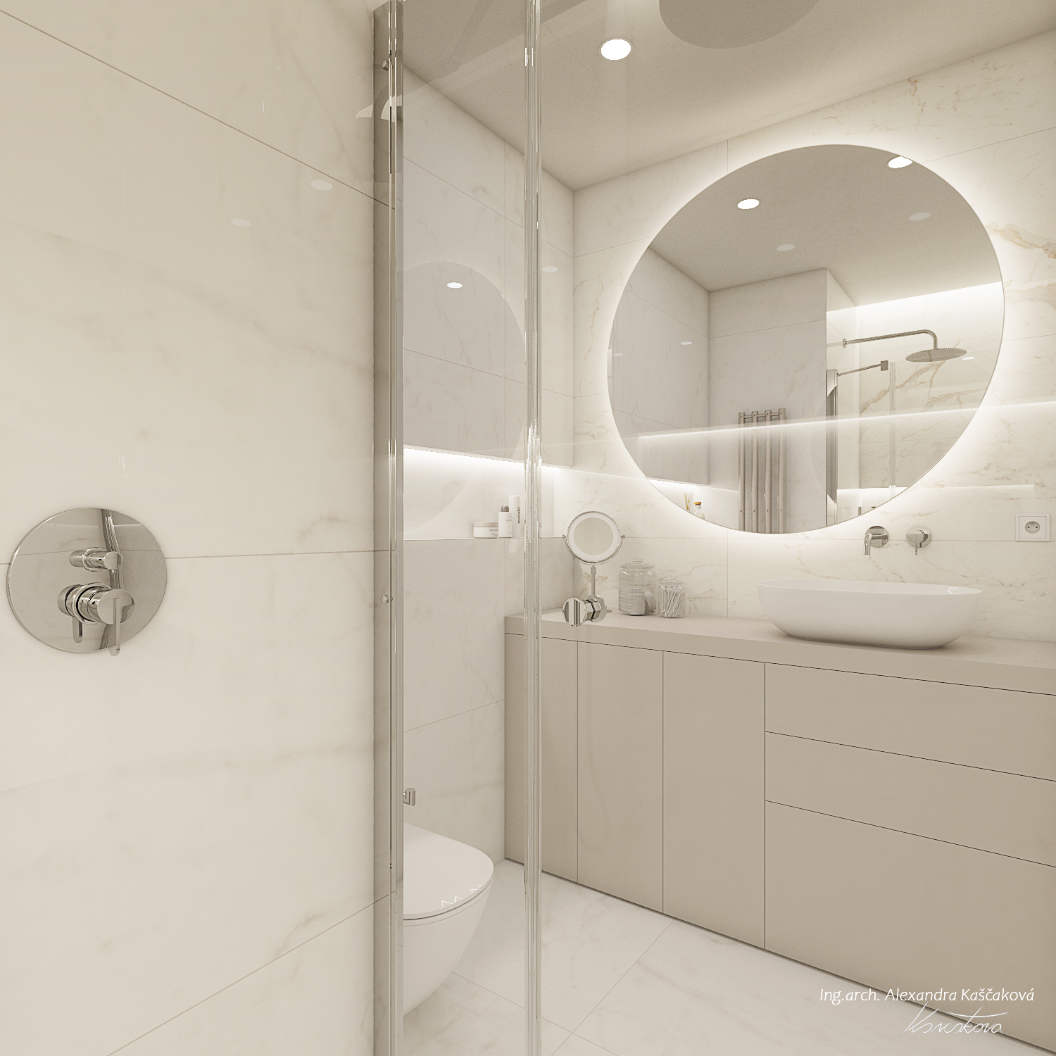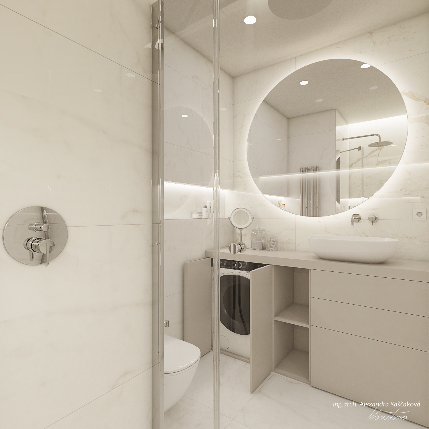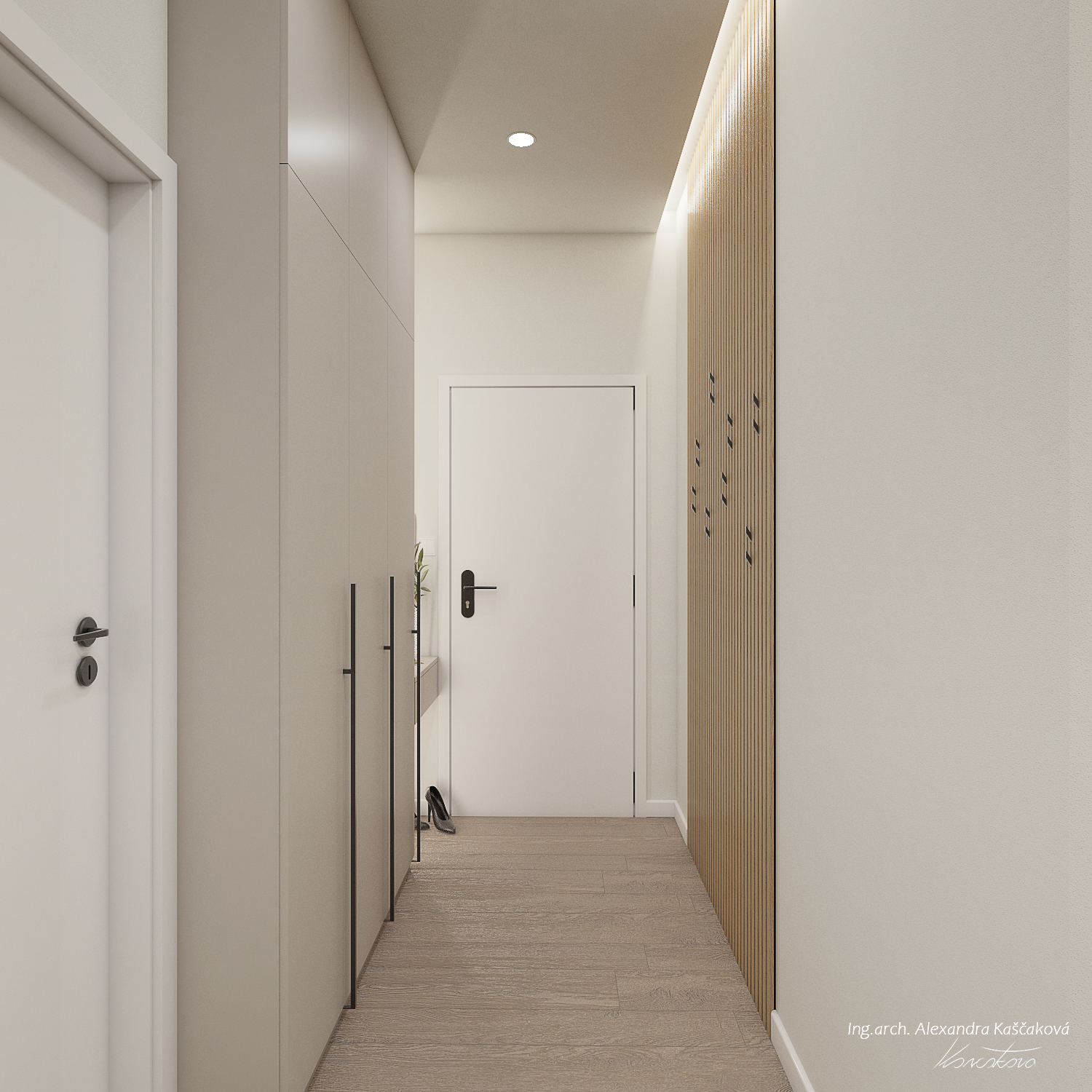 Zadáním klienta byla kompletní rekonstrukce bytu včetně změny dispozice pro vytvoření dalšího pokoje, např. pracovny nebo menšího dětského pokoje. Kuchyň jsme proto spojili s obývacím prostorem a umístili ji do zálivu vedle nově navrženého pokoje. Nově vzniklýí prostor jsme se rozhodli schovat za dveře v dekoru stěrky, která plynule pokračuje do obývacího prostoru. Byt jsme ladili do světlých barev, dominuje kombinace bílé, béžové a dubového dřevodekoru. Toto barevné schéma vytváří velmi klidnou a harmonickou atmosféru. Na vytvoření jemného kontrastu jsme použili černou barvu, která se objevuje pouze jako doplňková barva na kování, nohách sedacího nábytku, prosklených posuvných dveří či osvětlení. Osvětlení jsme mimo jiné řešili i v rámci podhledů a LED pásků, které jsme umístili za zrcadla, či pod poličky. Trochu elegance jsme do prostoru přinesli mramorovými obklady, které dominují v koupelně, ale také jsme je použili jako vystupující prvek za televizí.