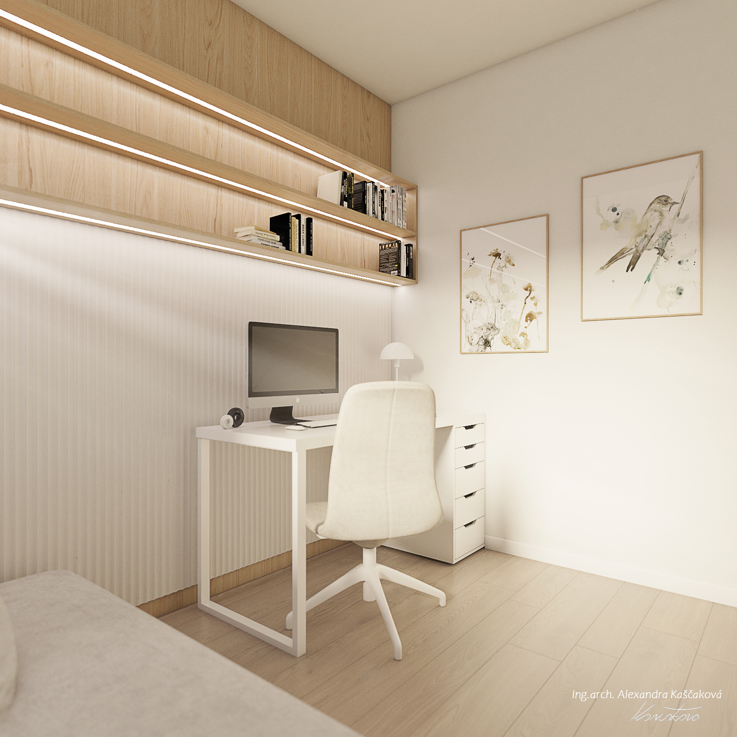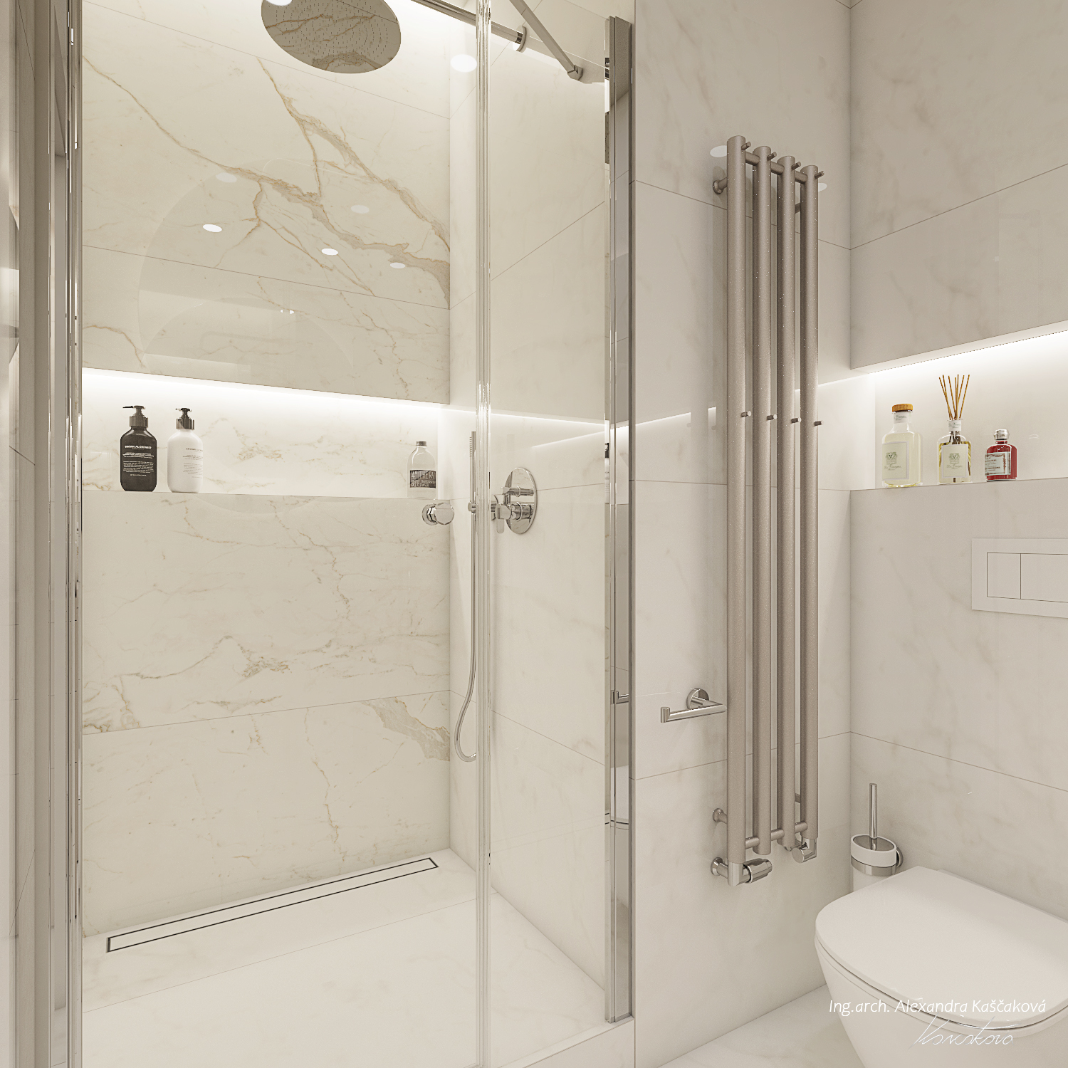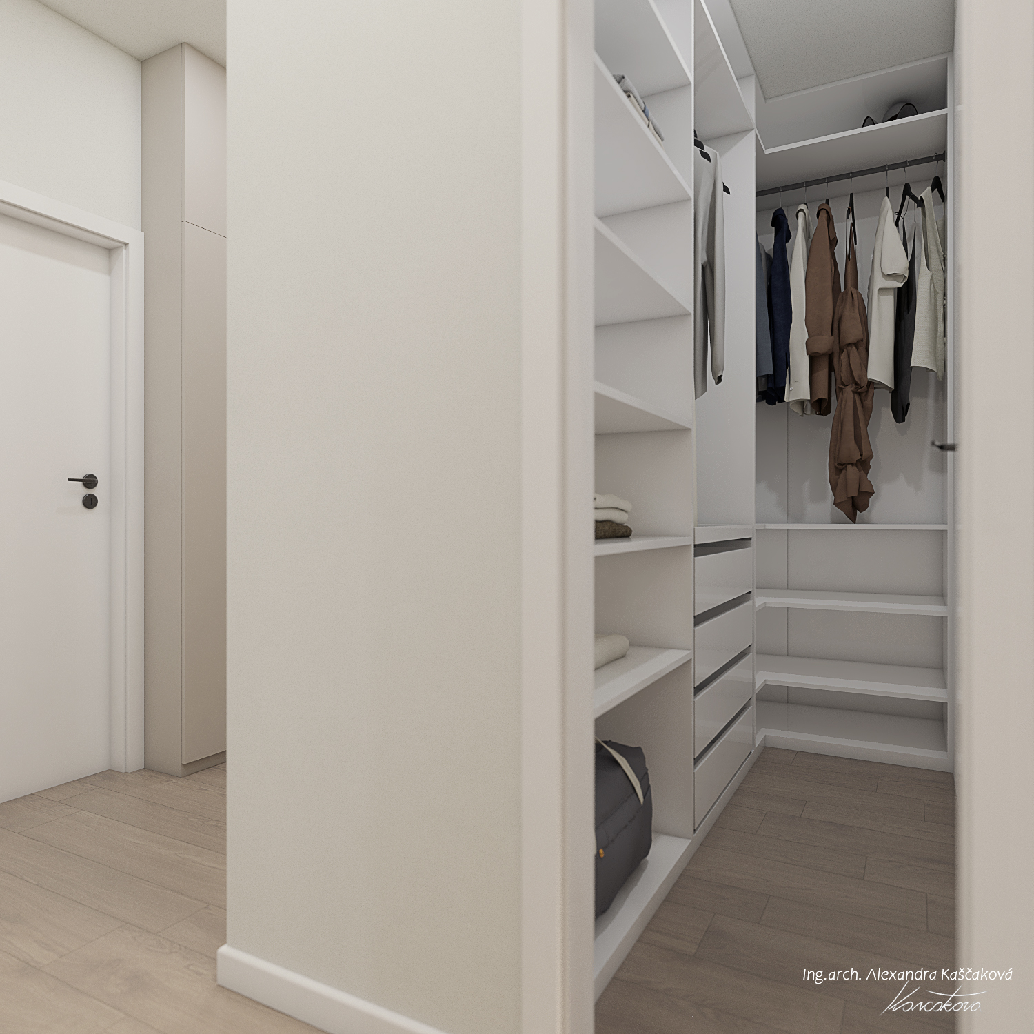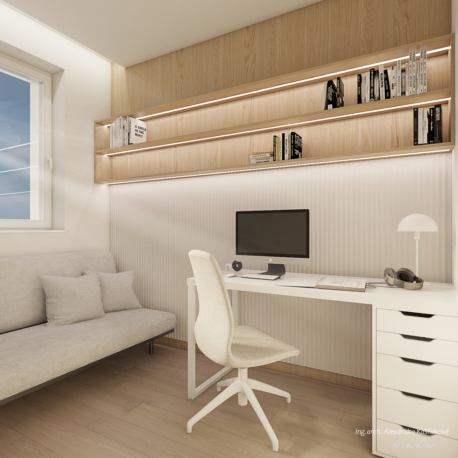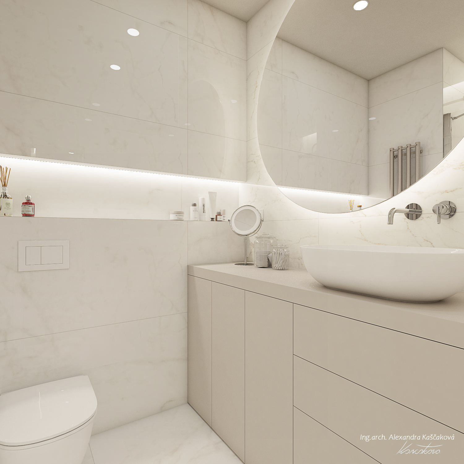 Zadáním klienta byla kompletní rekonstrukce bytu včetně změny dispozice pro vytvoření dalšího pokoje, např. pracovny nebo menšího dětského pokoje. Kuchyň jsme proto spojili s obývacím prostorem a umístili ji do zálivu vedle nově navrženého pokoje. Nově vzniklýí prostor jsme se rozhodli schovat za dveře v dekoru stěrky, která plynule pokračuje do obývacího prostoru. Byt jsme ladili do světlých barev, dominuje kombinace bílé, béžové a dubového dřevodekoru. Toto barevné schéma vytváří velmi klidnou a harmonickou atmosféru. Na vytvoření jemného kontrastu jsme použili černou barvu, která se objevuje pouze jako doplňková barva na kování, nohách sedacího nábytku, prosklených posuvných dveří či osvětlení. Osvětlení jsme mimo jiné řešili i v rámci podhledů a LED pásků, které jsme umístili za zrcadla, či pod poličky. Trochu elegance jsme do prostoru přinesli mramorovými obklady, které dominují v koupelně, ale také jsme je použili jako vystupující prvek za televizí.