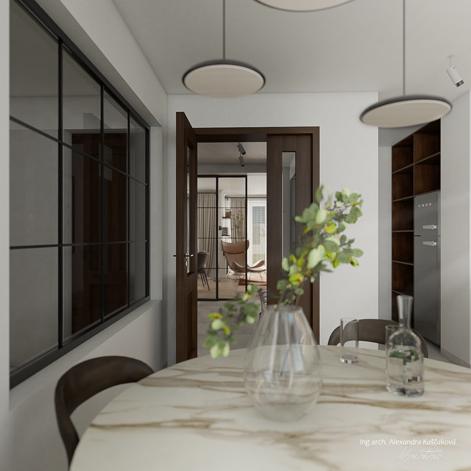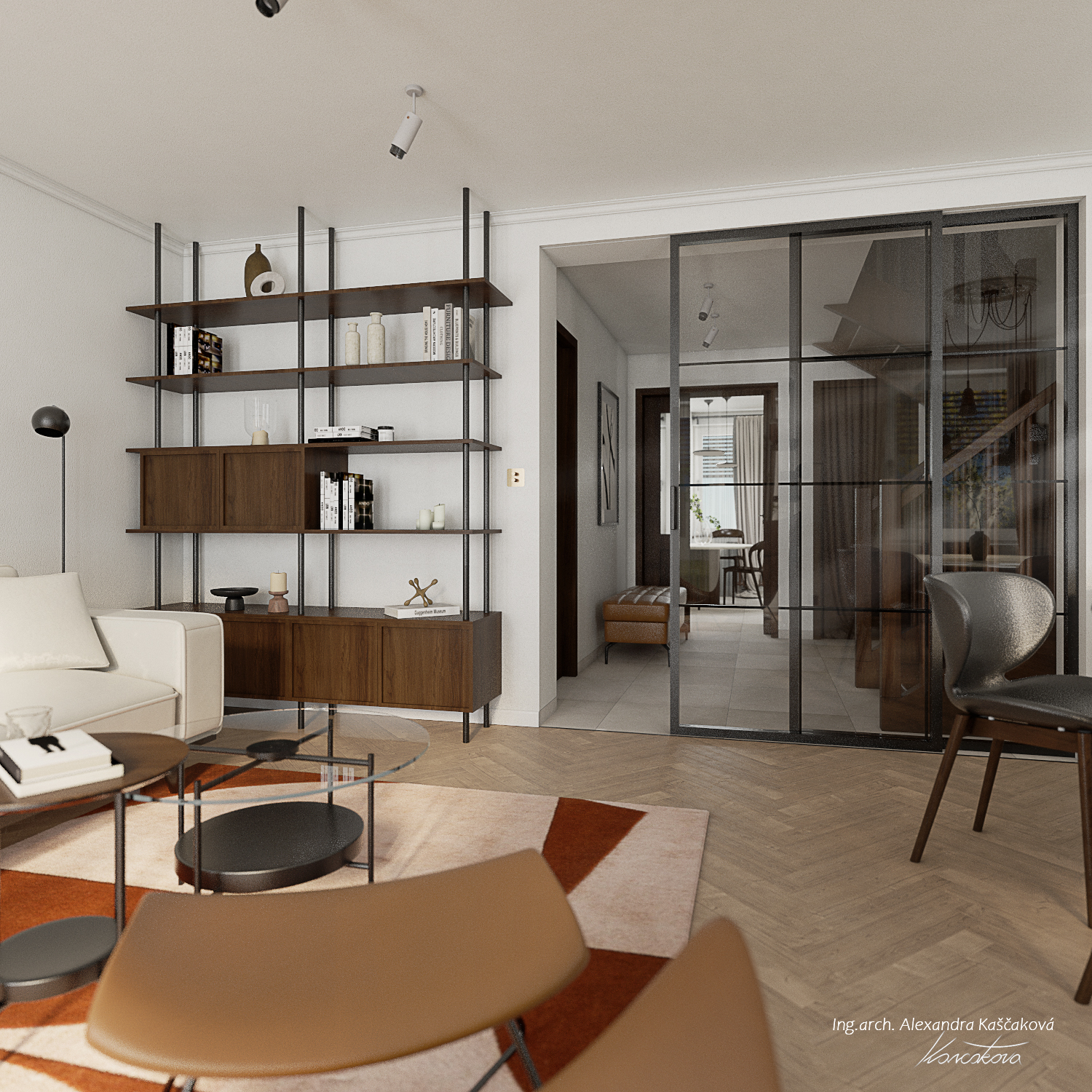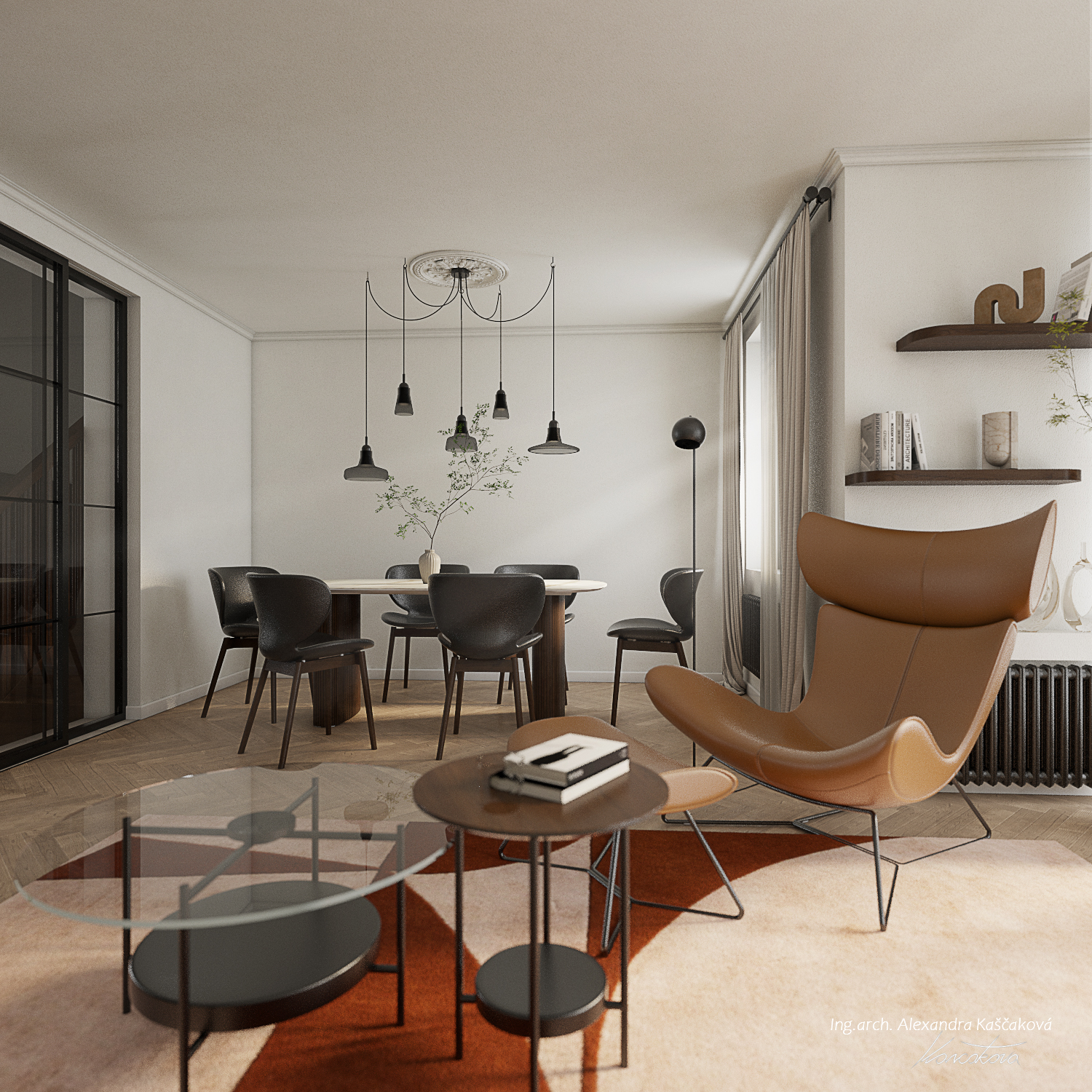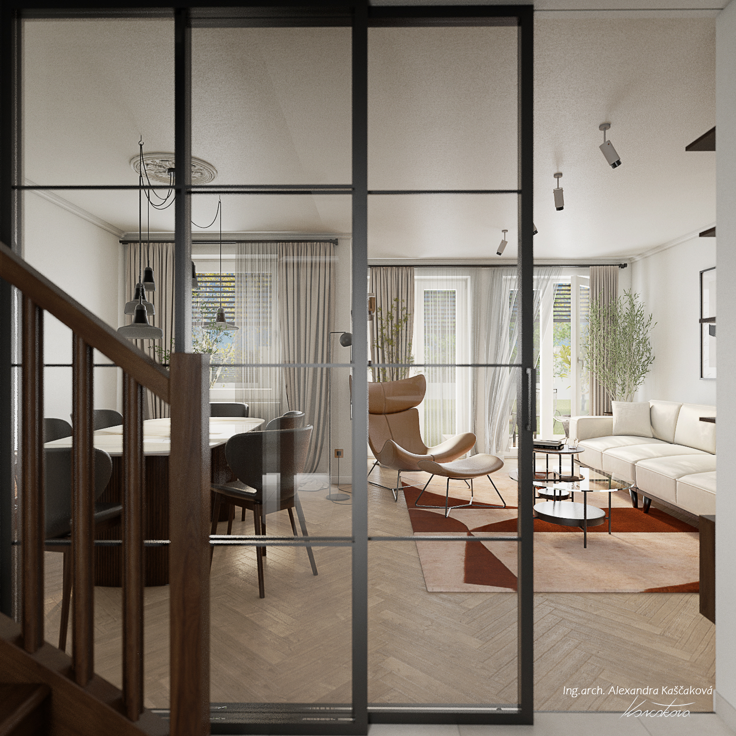 Studie RD na Praze 6 je příkladem, jak lze spojit klasický styl s funkcionalistickými prvky. Prostorem dominují jednoduché, čisté linie, které přinášejí pocit uspořádanosti a elegance. .Jednotlivé kusy nábytku slouží svému účelu a zároveň, také jako klíčový estetický prvek. Každý kus je vybrán tak, aby podporoval celkový design prostoru, často s důrazem na kvalitní materiály a jednoduché, ale efektní tvary. Interiér je koncipován jako otevřený, což podporuje pocit prostornosti a svobody pohybu. Jednotlivé prostory jsou opticky oddělenyé skleněnými tabulemi s orámováním z černého kovu. Tento industriální prvek dodává místnostem jistý pocit intimity, ale zároveň je zanechává vzdušnými. Použití materiálů jako kůže, tmavé dřevo a elegantní kámen v kuchyni nebo u jídelního stolu přináší do interiéru teplo a přirozenost. Sádrové prvky jako lišty na stropě nebo zdobná rozeta nad jídelním stolem dodávají interiéru dávku klasické elegance. Tyto detaily mohou být vnímány jako odkaz na historické styly, skrze které se prostor jemně dotýká minulosti, aniž by ztrácel svou moderní podstatu.