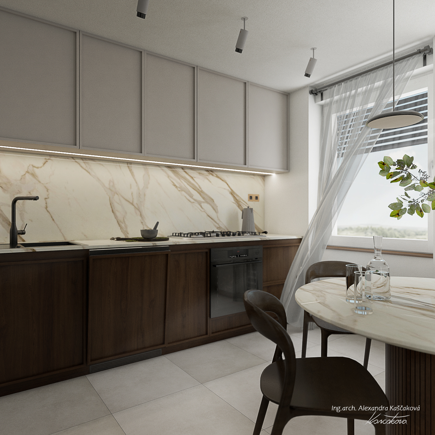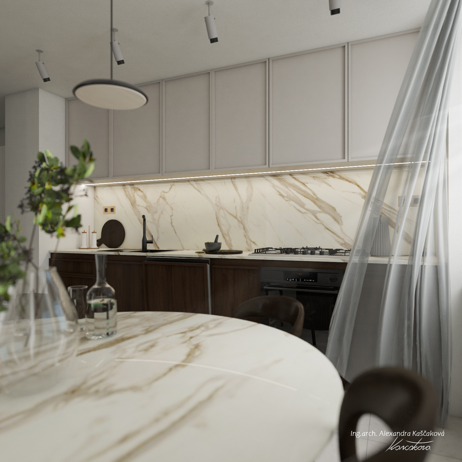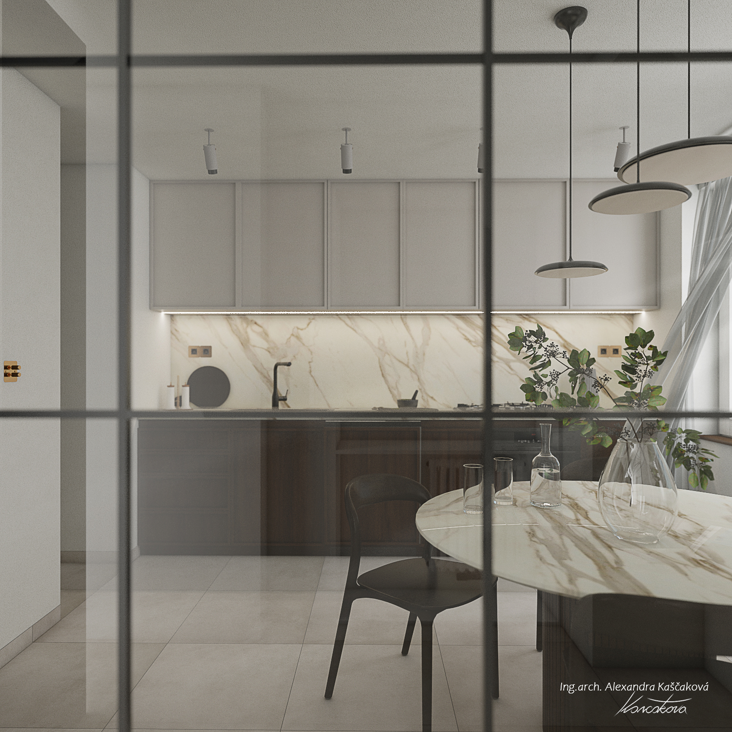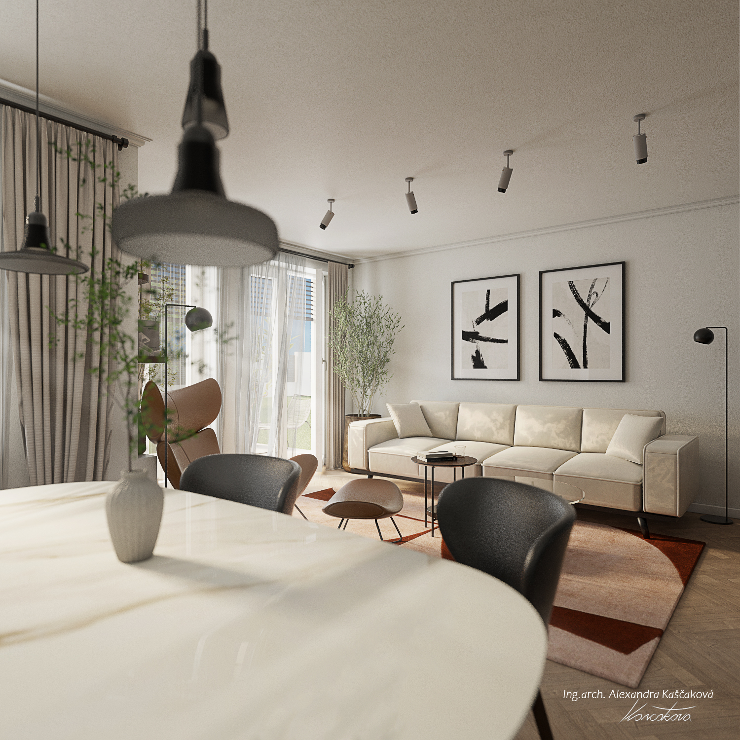 Studie RD na Praze 6 je příkladem, jak lze spojit klasický styl s funkcionalistickými prvky. Prostorem dominují jednoduché, čisté linie, které přinášejí pocit uspořádanosti a elegance. .Jednotlivé kusy nábytku slouží svému účelu a zároveň, také jako klíčový estetický prvek. Každý kus je vybrán tak, aby podporoval celkový design prostoru, často s důrazem na kvalitní materiály a jednoduché, ale efektní tvary. Interiér je koncipován jako otevřený, což podporuje pocit prostornosti a svobody pohybu. Jednotlivé prostory jsou opticky oddělenyé skleněnými tabulemi s orámováním z černého kovu. Tento industriální prvek dodává místnostem jistý pocit intimity, ale zároveň je zanechává vzdušnými. Použití materiálů jako kůže, tmavé dřevo a elegantní kámen v kuchyni nebo u jídelního stolu přináší do interiéru teplo a přirozenost. Sádrové prvky jako lišty na stropě nebo zdobná rozeta nad jídelním stolem dodávají interiéru dávku klasické elegance. Tyto detaily mohou být vnímány jako odkaz na historické styly, skrze které se prostor jemně dotýká minulosti, aniž by ztrácel svou moderní podstatu.