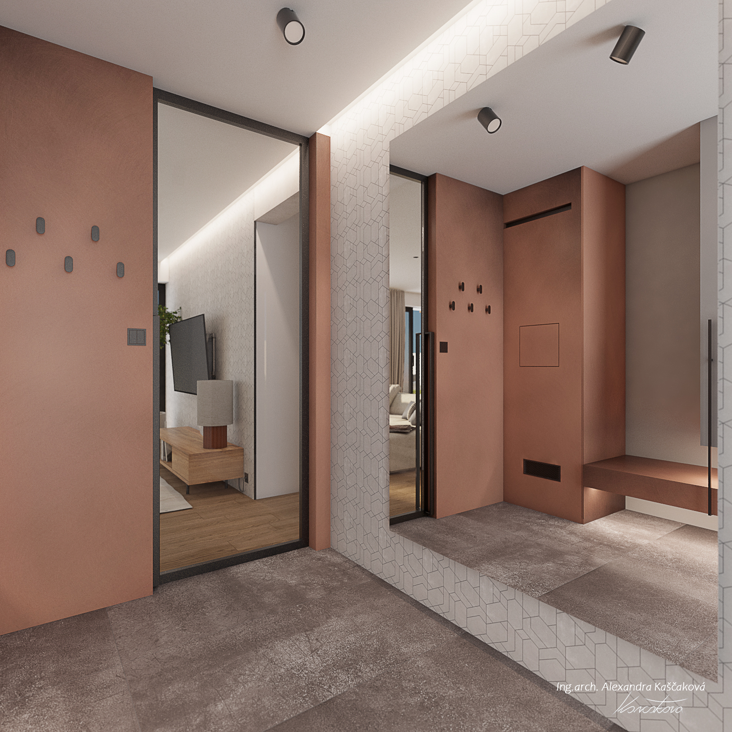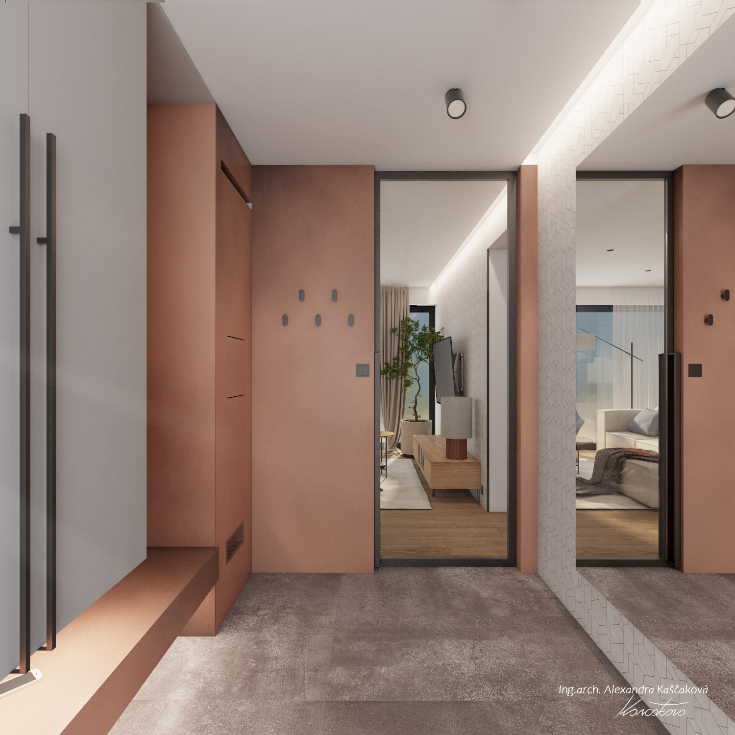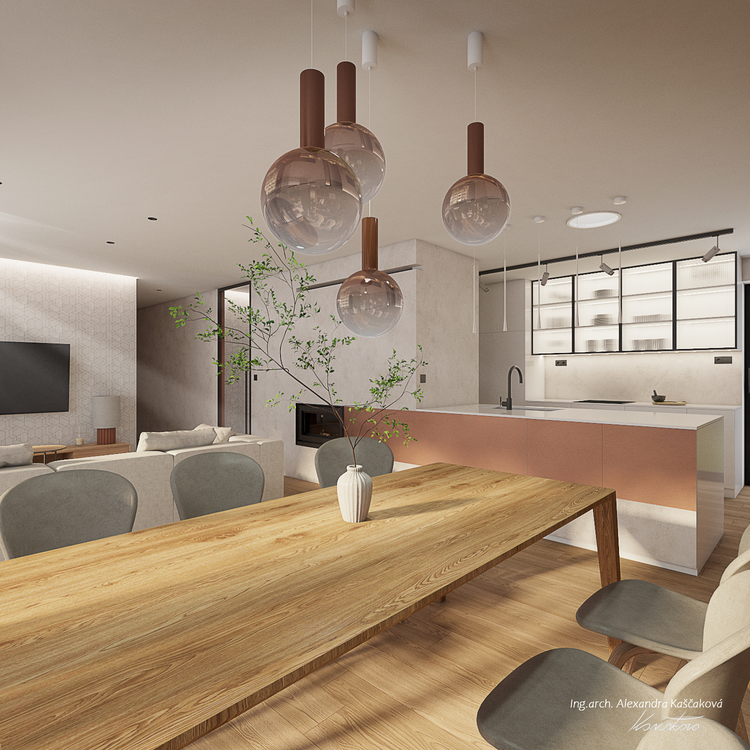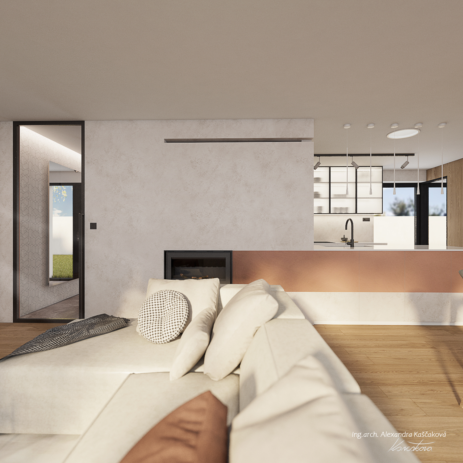 Koncept interiéru domu v Kosové Hoře je založený na propojení místností skrze průhledy, kde se materiály plynule doplňují, čímž pocitově vzniká neohraničený prostor. Materiálově jsme vycházeli z dubového dekoru dřeva, stěrky a dlažeb v imitaci kovu. I když se na první pohled vychází ze surovějších materiálů, interiér jsme chtěli nést v duchu teplého rodinného bydlení. Proto jsme dbali na to, aby byla textura vykreslená jemně a studené barvy byly doplněny o teplé materiály. Dominují jemné geometrické vzory, např. mozaika napodobující beton v chodbě a obývacím prostoru, a geometrické motivy v nikách dětské koupelny. Barevný akcent je využitý například v podobě stěrky na krbu, za pomoci které se nám je podařilo opticky prodloužit z obývacího do jídelního prostoru. Kuchyň v bílém provedení podtrhuje čistý, moderní vzhled a nijak nezahlcuje prostor. Vestavná knihovna v dekoru dřeva nám plynule navazuje na zeď s dveřmi, které jsou řešené ze stejného materiálu a jejich bezfalcové provedení se skrytými zárubněmi nám opticky propojuje jídelnu s kuchyňským prostorem. Za dveřmi se schovává ložnice, které dominují čalouněné panely v měděném odstínu s vertikálními LED páskami a předstěnou ve stěrce.