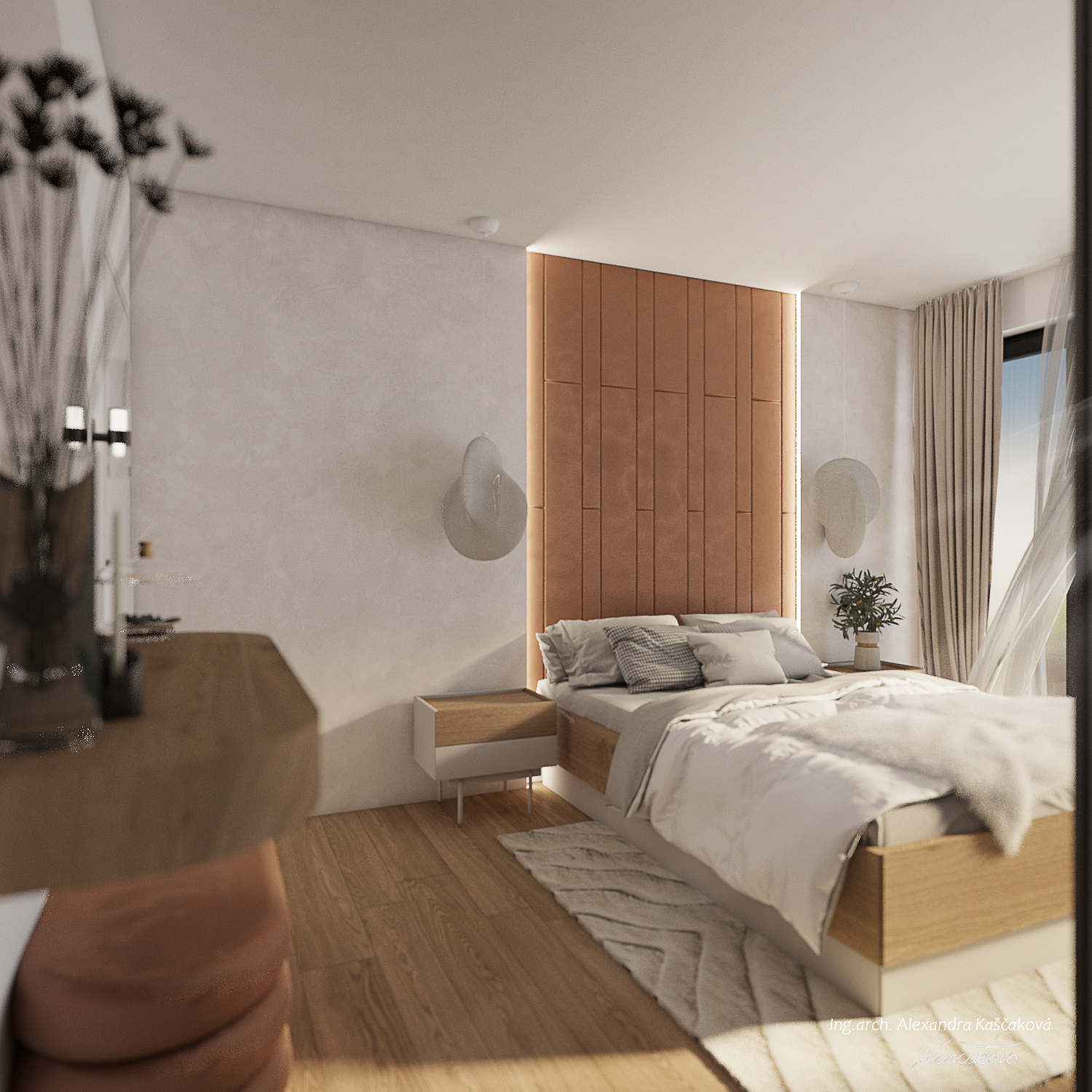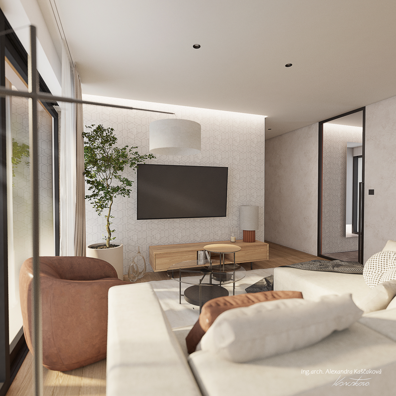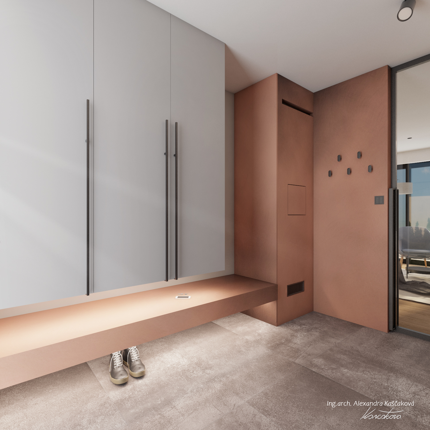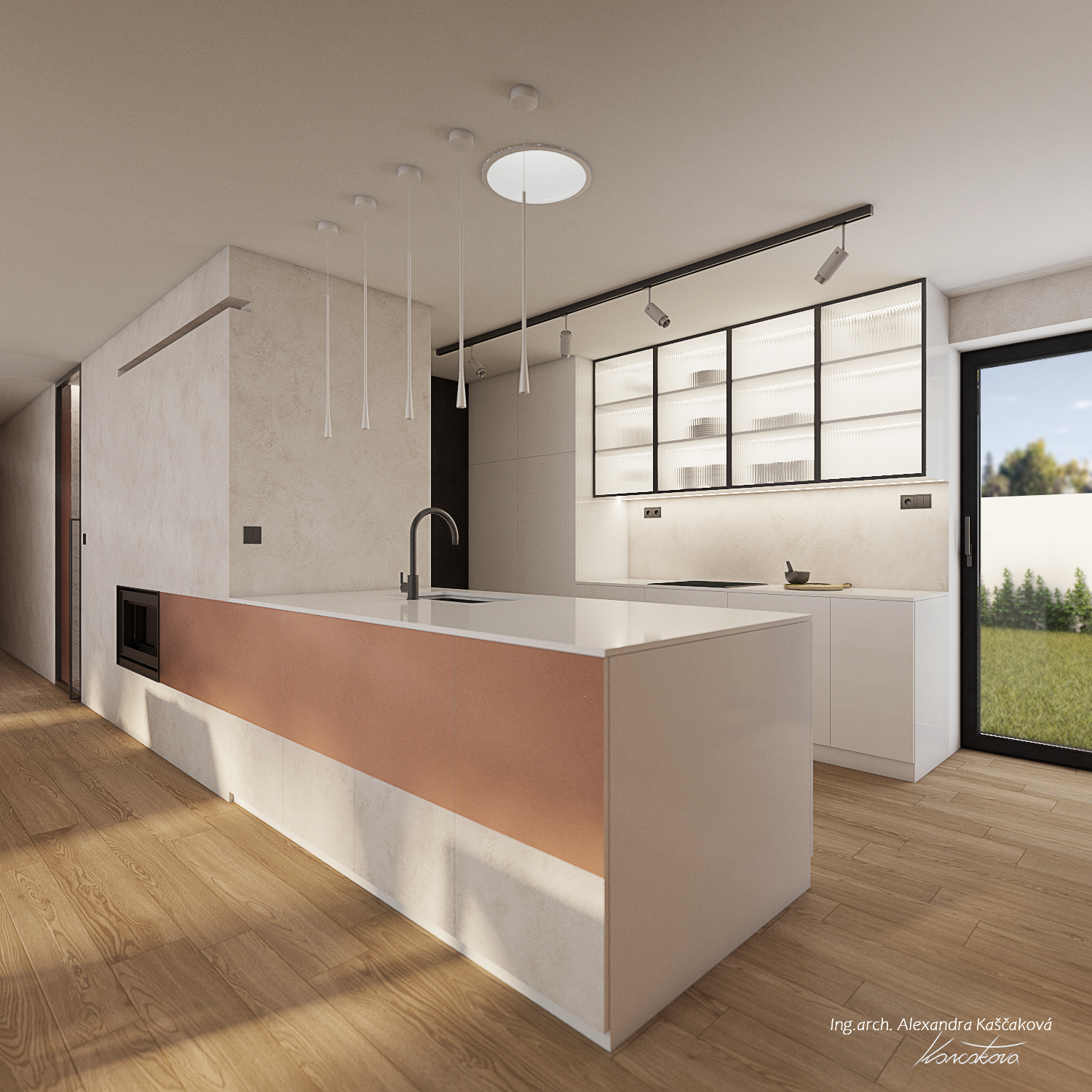 Koncept interiéru domu v Kosové Hoře je založený na propojení místností skrze průhledy, kde se materiály plynule doplňují, čímž pocitově vzniká neohraničený prostor. Materiálově jsme vycházeli z dubového dekoru dřeva, stěrky a dlažeb v imitaci kovu. I když se na první pohled vychází ze surovějších materiálů, interiér jsme chtěli nést v duchu teplého rodinného bydlení. Proto jsme dbali na to, aby byla textura vykreslená jemně a studené barvy byly doplněny o teplé materiály. Dominují jemné geometrické vzory, např. mozaika napodobující beton v chodbě a obývacím prostoru, a geometrické motivy v nikách dětské koupelny. Barevný akcent je využitý například v podobě stěrky na krbu, za pomoci které se nám je podařilo opticky prodloužit z obývacího do jídelního prostoru. Kuchyň v bílém provedení podtrhuje čistý, moderní vzhled a nijak nezahlcuje prostor. Vestavná knihovna v dekoru dřeva nám plynule navazuje na zeď s dveřmi, které jsou řešené ze stejného materiálu a jejich bezfalcové provedení se skrytými zárubněmi nám opticky propojuje jídelnu s kuchyňským prostorem. Za dveřmi se schovává ložnice, které dominují čalouněné panely v měděném odstínu s vertikálními LED páskami a předstěnou ve stěrce.