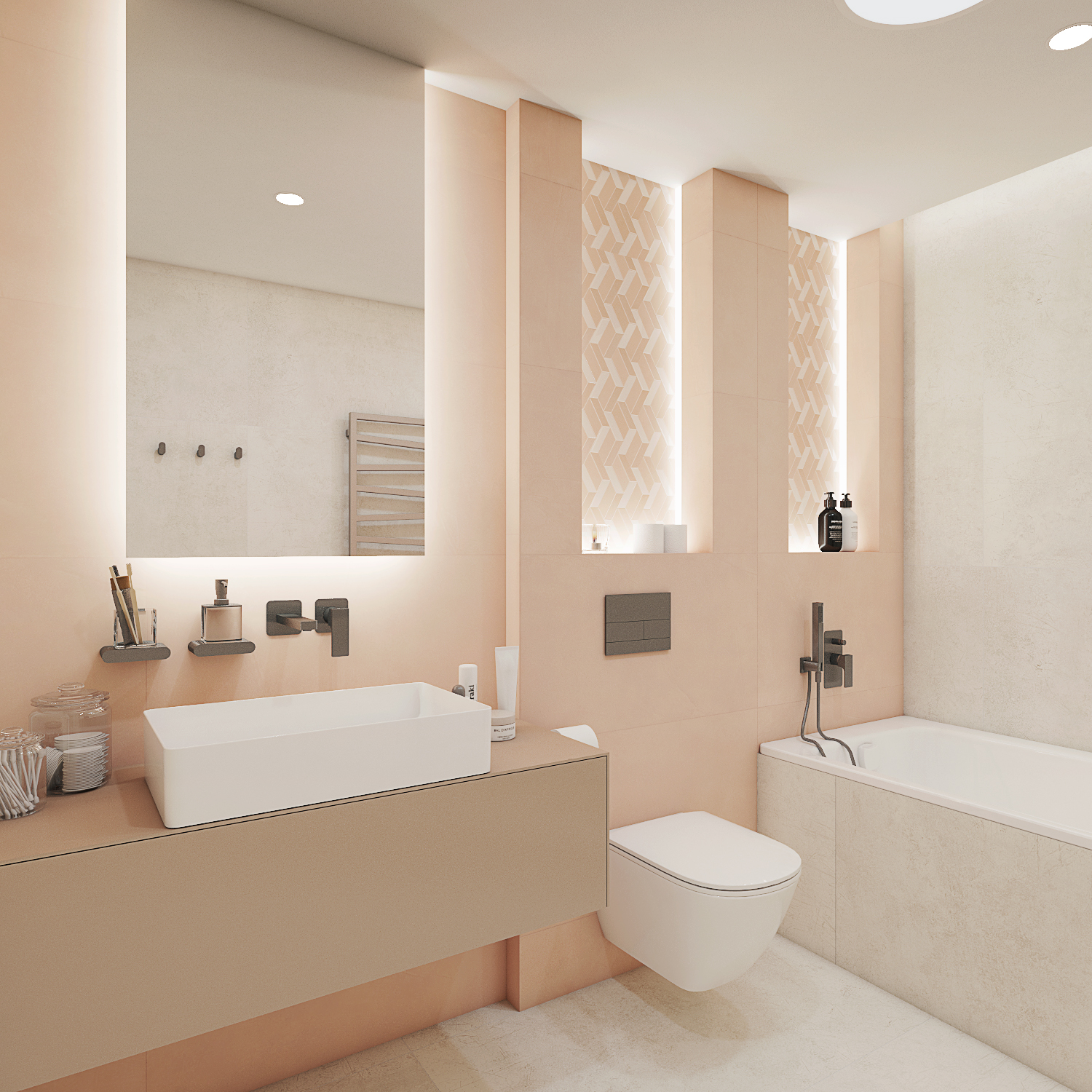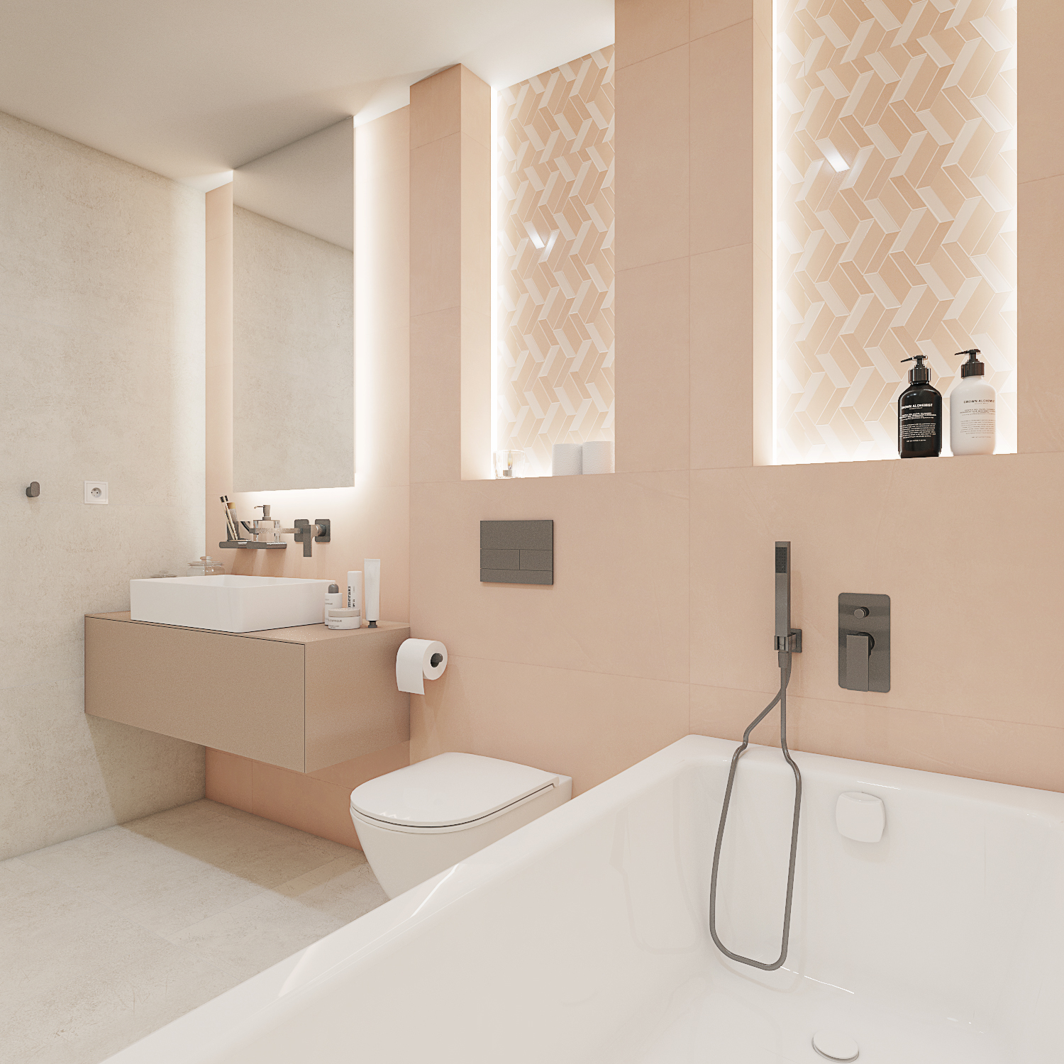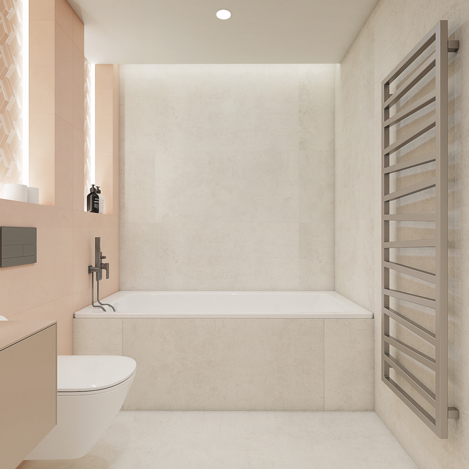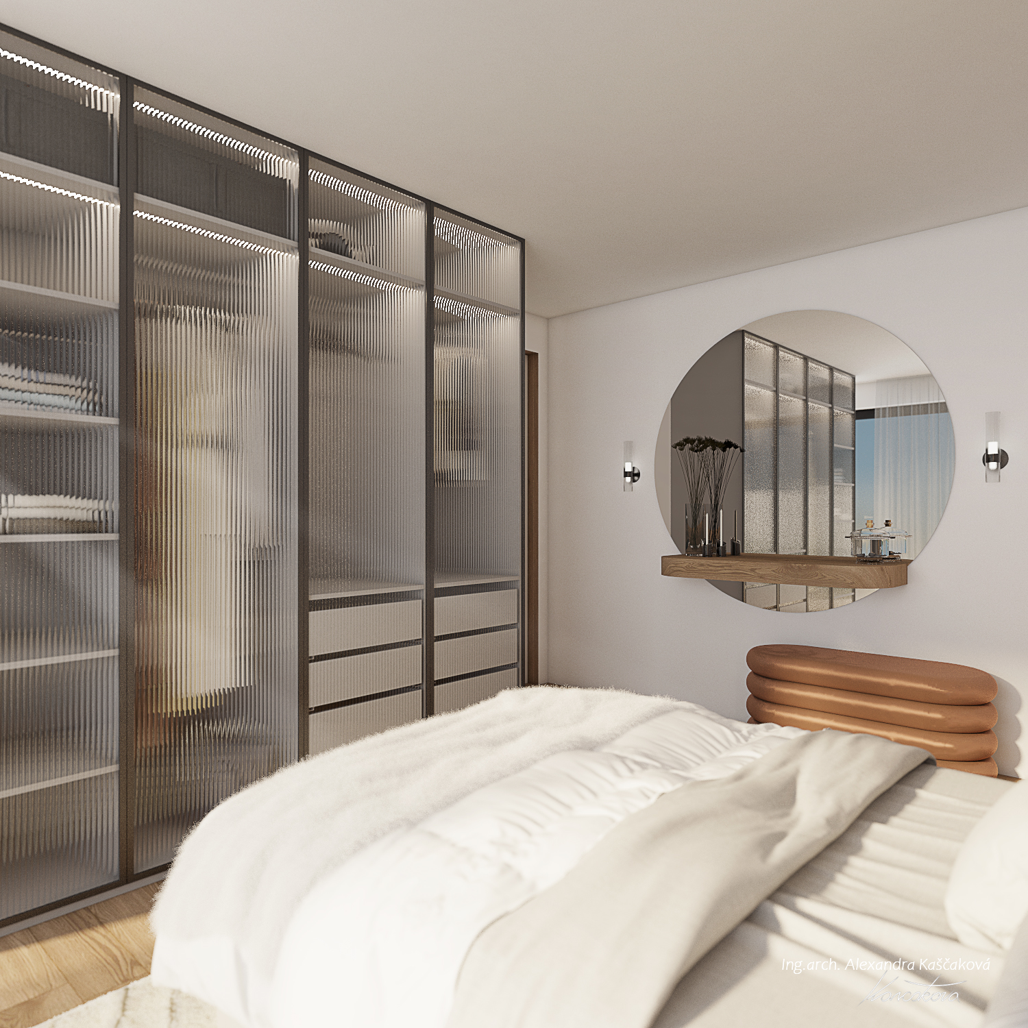 Koncept interiéru domu v Kosové Hoře je založený na propojení místností skrze průhledy, kde se materiály plynule doplňují, čímž pocitově vzniká neohraničený prostor. Materiálově jsme vycházeli z dubového dekoru dřeva, stěrky a dlažeb v imitaci kovu. I když se na první pohled vychází ze surovějších materiálů, interiér jsme chtěli nést v duchu teplého rodinného bydlení. Proto jsme dbali na to, aby byla textura vykreslená jemně a studené barvy byly doplněny o teplé materiály. Dominují jemné geometrické vzory, např. mozaika napodobující beton v chodbě a obývacím prostoru, a geometrické motivy v nikách dětské koupelny. Barevný akcent je využitý například v podobě stěrky na krbu, za pomoci které se nám je podařilo opticky prodloužit z obývacího do jídelního prostoru. Kuchyň v bílém provedení podtrhuje čistý, moderní vzhled a nijak nezahlcuje prostor. Vestavná knihovna v dekoru dřeva nám plynule navazuje na zeď s dveřmi, které jsou řešené ze stejného materiálu a jejich bezfalcové provedení se skrytými zárubněmi nám opticky propojuje jídelnu s kuchyňským prostorem. Za dveřmi se schovává ložnice, které dominují čalouněné panely v měděném odstínu s vertikálními LED páskami a předstěnou ve stěrce.