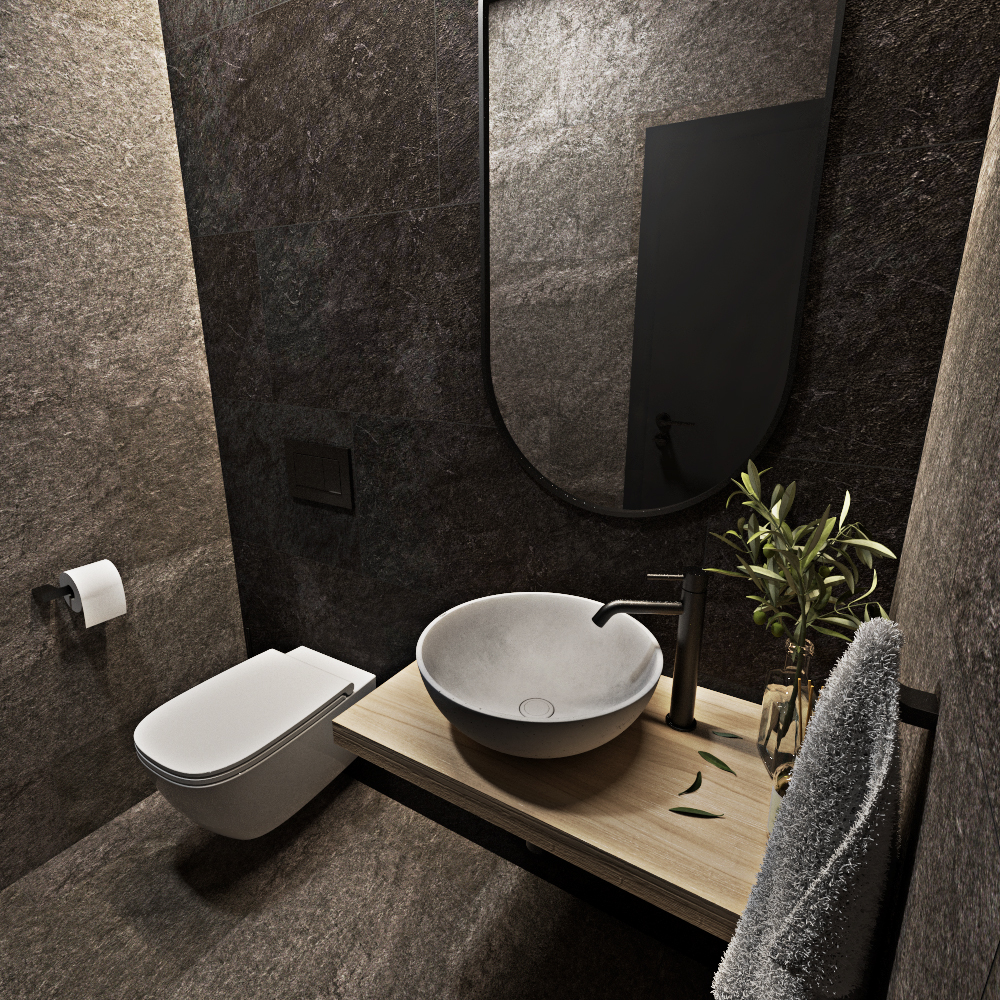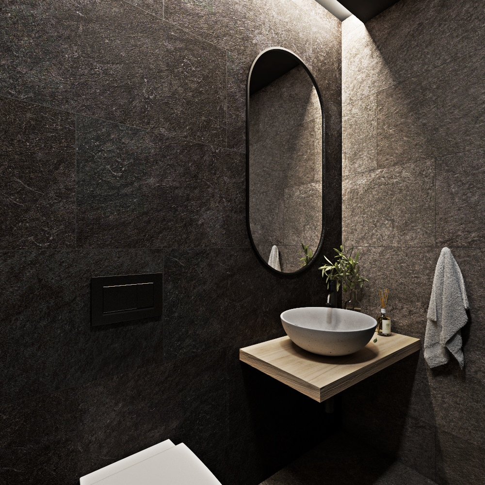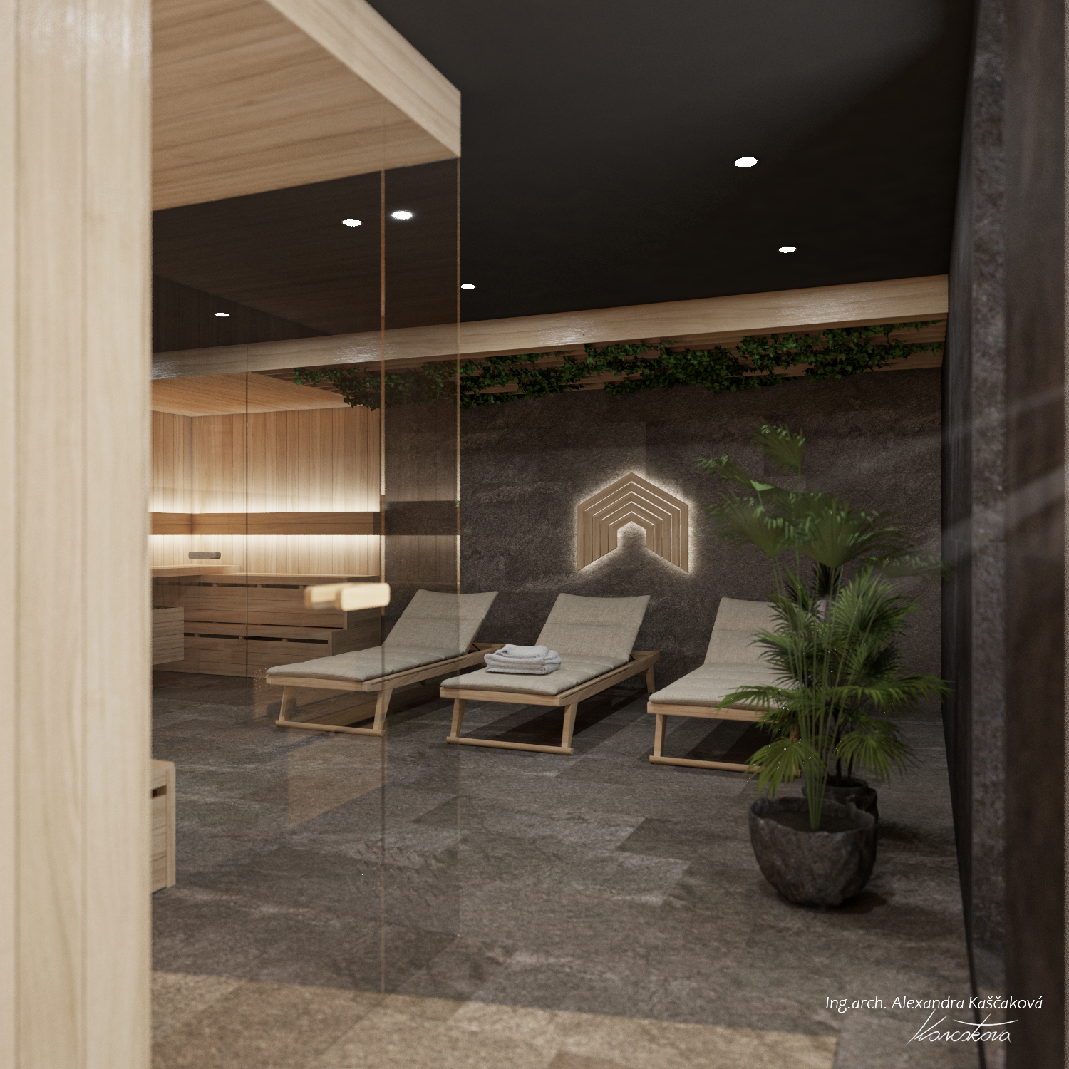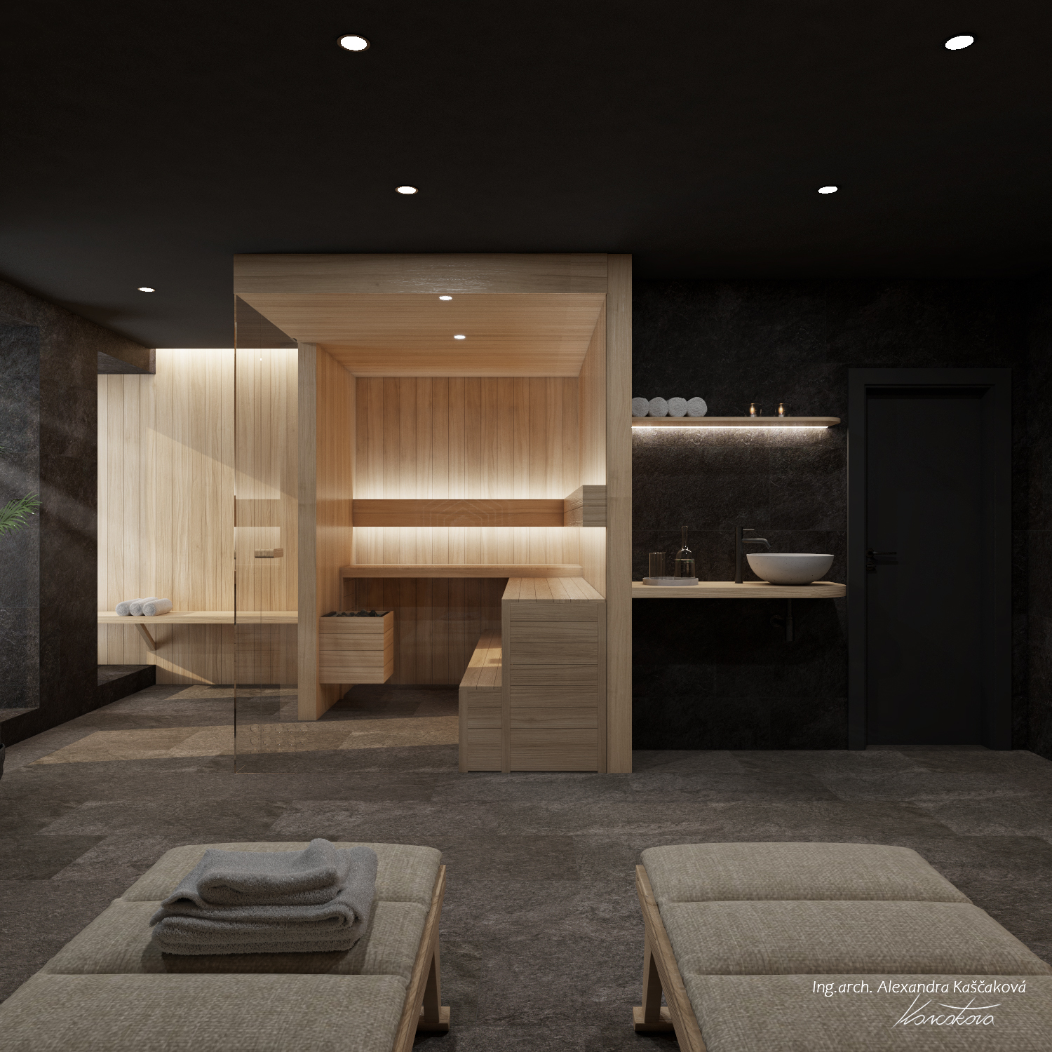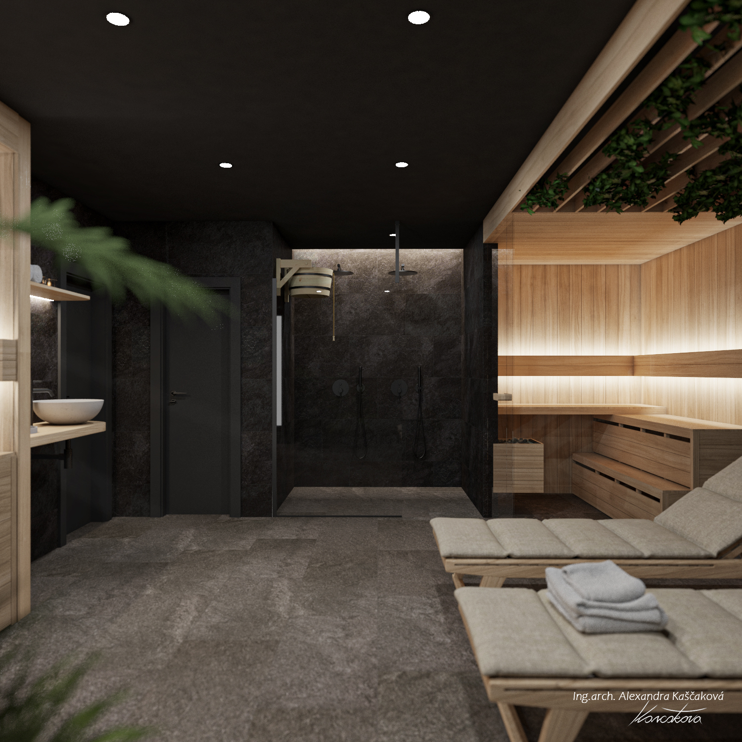 Wellness místnost s dvěma saunami, která čerpá inspiraci z horské přírody v Benecku, je navržena tak, aby poskytovala maximální relaxaci a uklidnění. V této koncepci jsem se rozhodla využít tmavé, zemitější barvy, které nejenže navozují pocit hlubokého odpočinku, ale také přirozeně ladí s horským prostředím. Na tmavých stěnách a podlaze vynikají detaily ze světlého dřeva, které vytváří harmonický kontrast. Krajina kolem se odráží v nepravidelnosti a jedinečnosti daného prostoru, proto jsou dlaždice a další prvky interiéru rozmístěny nahodile, což vytváří pocit organického a přirozeného prostoru. Rovněž pro harmonické napojení s přírodou jsme upustili od bílé keramiky, kterou nahradilo betonového umyvadlo. O jeho fungování se stará matně černá baterie, která je pro celý prostor charakteristická.