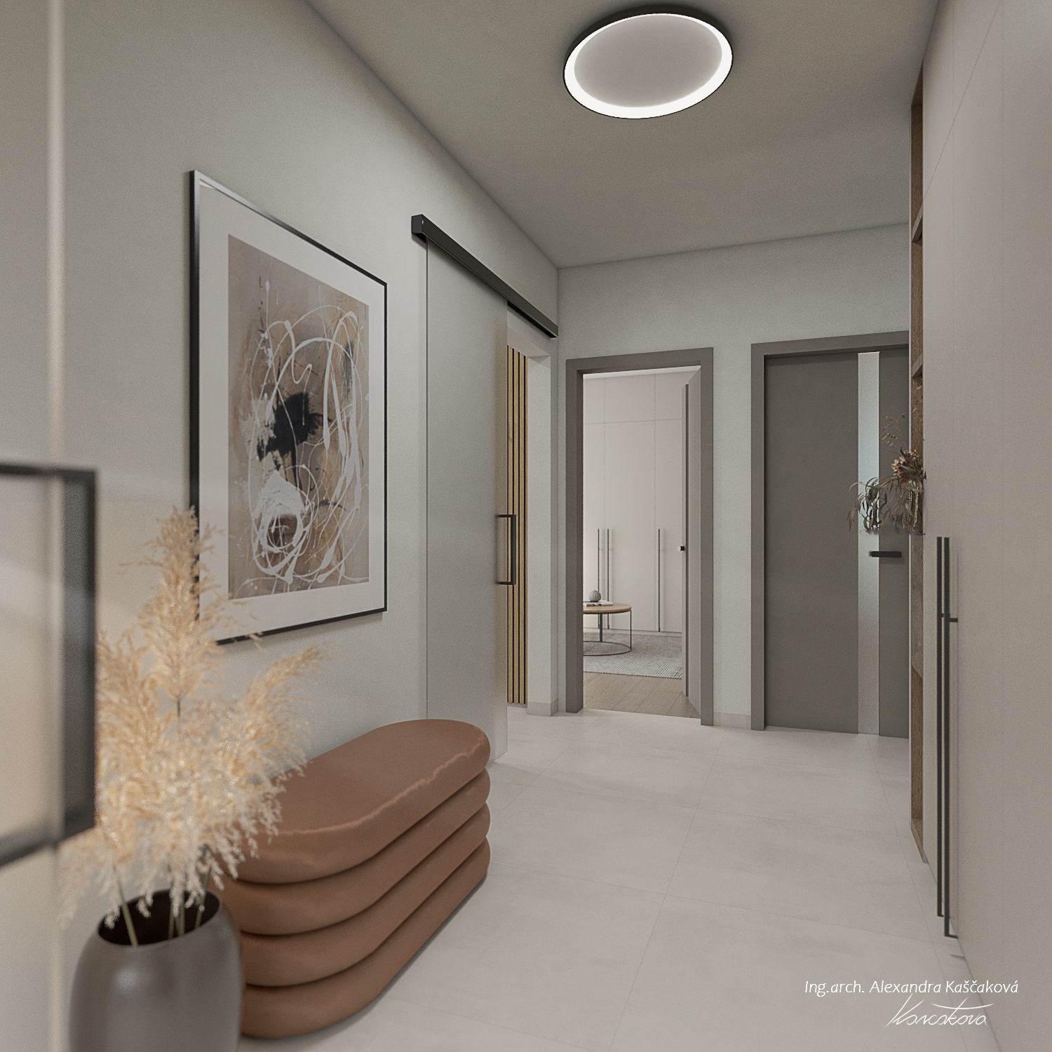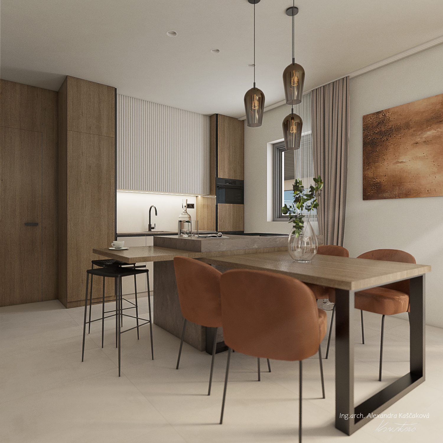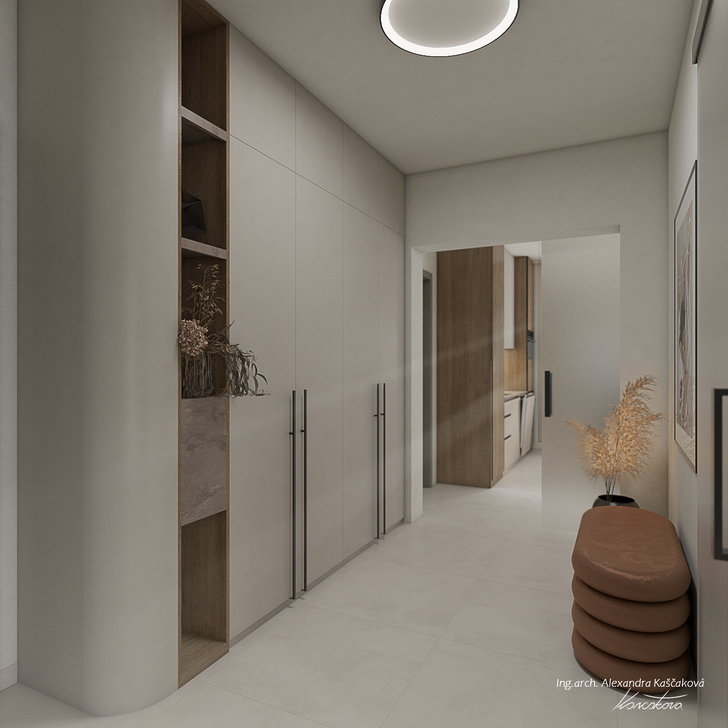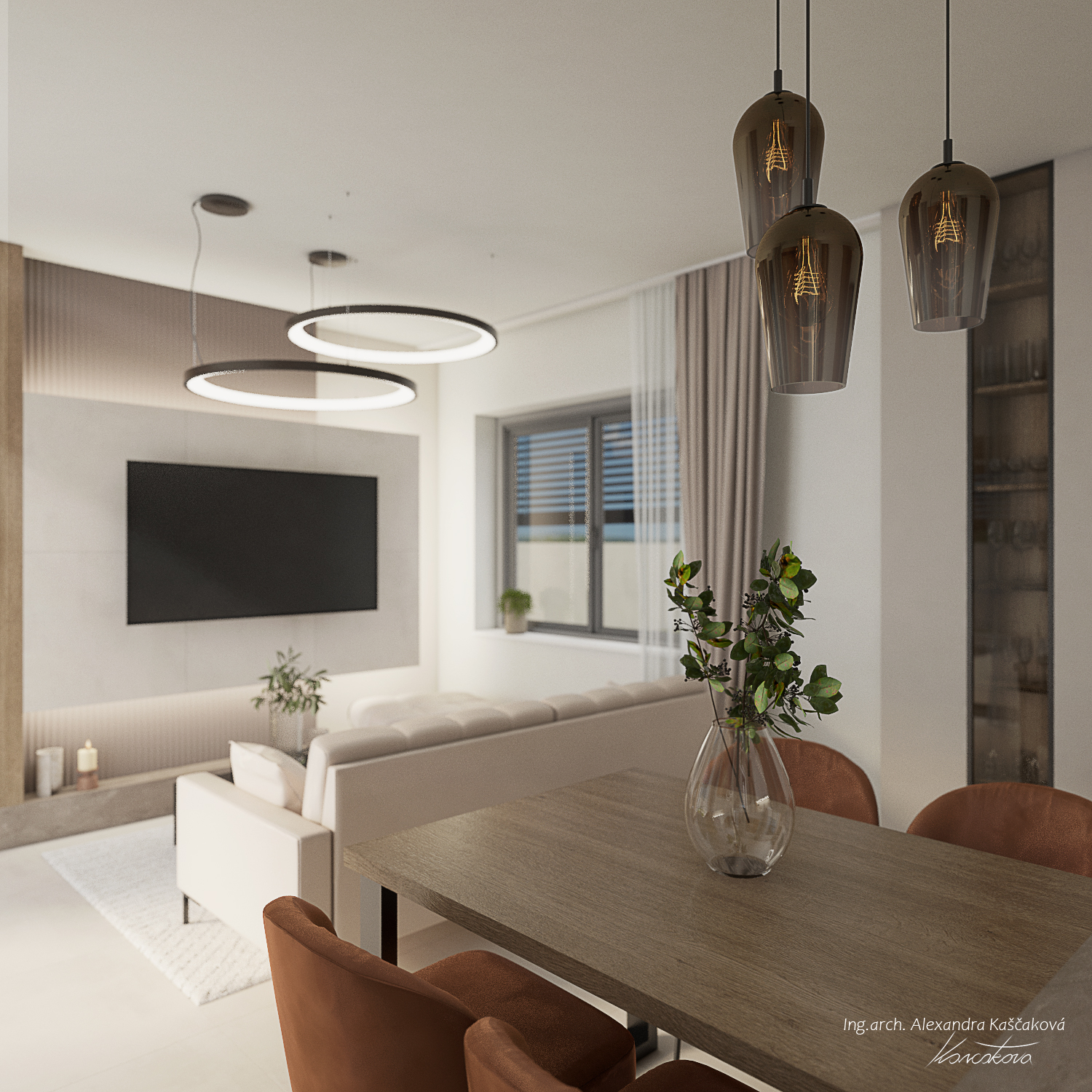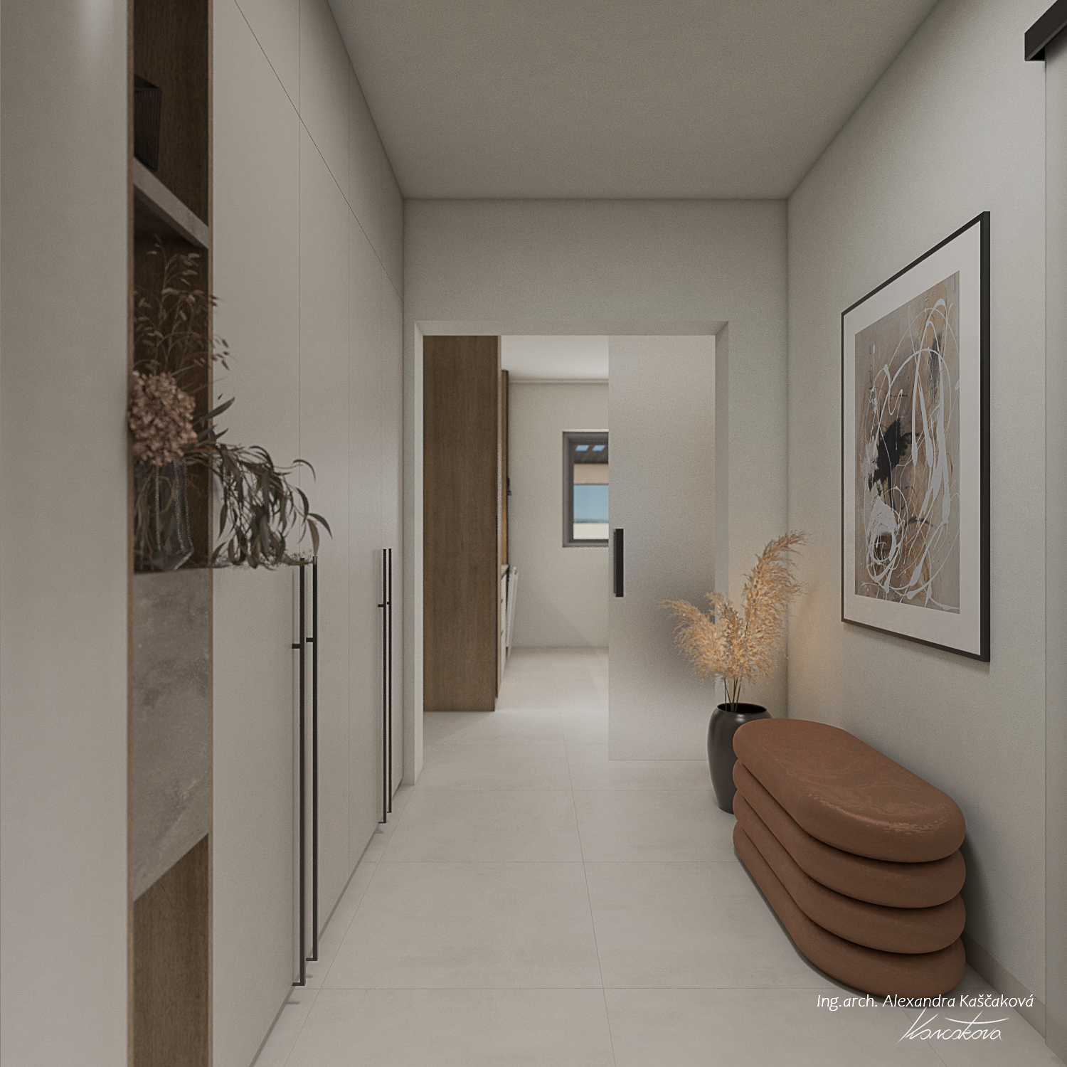 Návrh interiéru rodinného domu v Senomatech, řeší prostory o rozloze 96 m2. Jedná se tedy o menší domek, který jsme se s klientkou rozhodli pojmout v krémových a měděných tónech. Dlažba v decentní imitaci světlého betonu propojuje interiér od vstupní chodby až po samotný obytný prostor s kuchyní. Světlé podlahy v celém domě zdůrazňují textury a barvy, což vytváří kontrast, ale zároveň udržuje prostor vzdušný. Dominantním prvkem v obývacím prostoru je ostrůvek z corianu, ze kterého je vykonzolovaný jídelní stůl a barový pult v dřevodekoru. Prvek corianu můžeme najít i pod televizí nebo na chodbě, kde je zakomponovaný v nice skříně. V rámci celého interiéru pracujeme hodně s vertikálami, které se objevují za použití reliéfních obkladů za televizí, horními skříňkami v kuchyni nebo i v pracovně a na chodbě. Černé detaily dodávají interiéru akcent a kontrast.