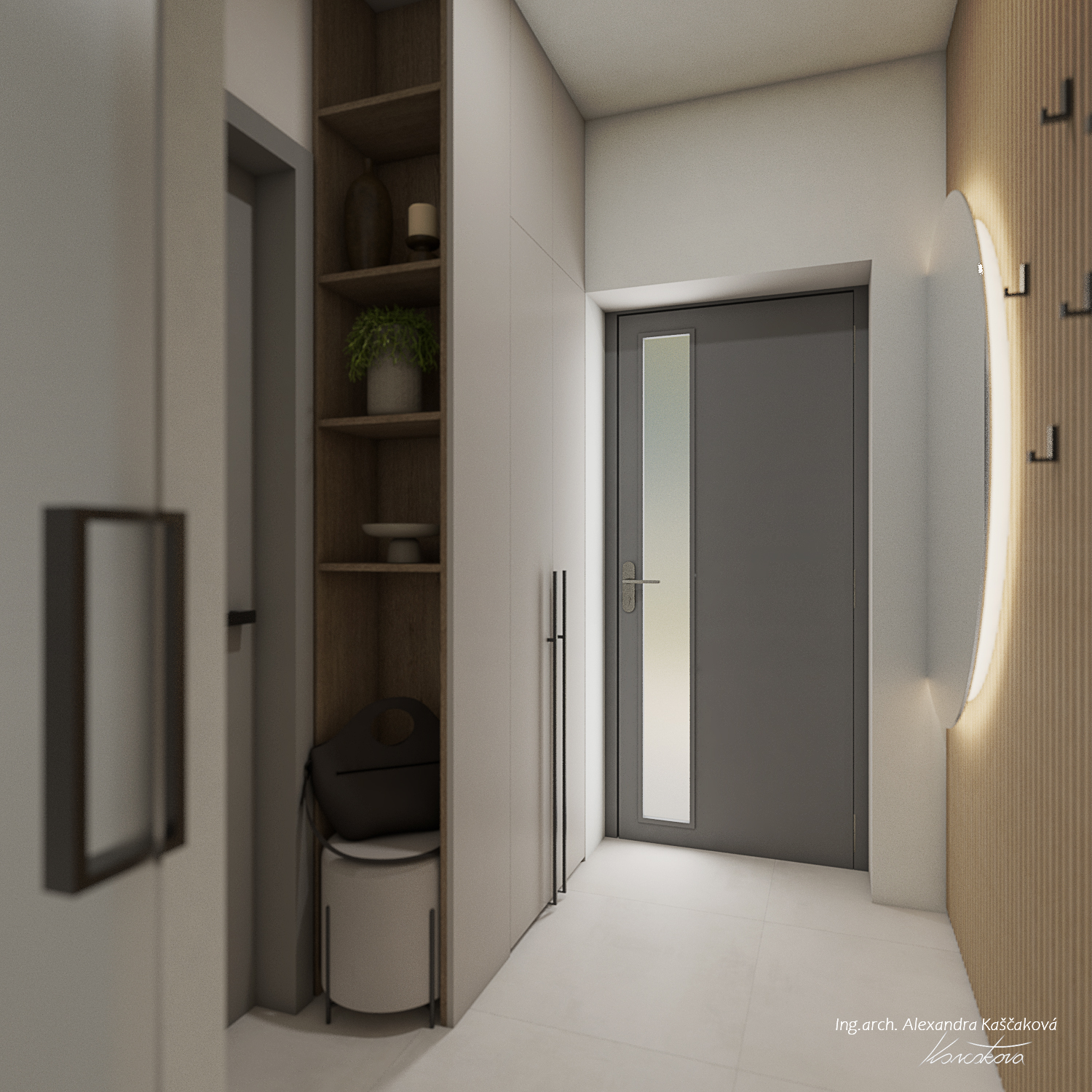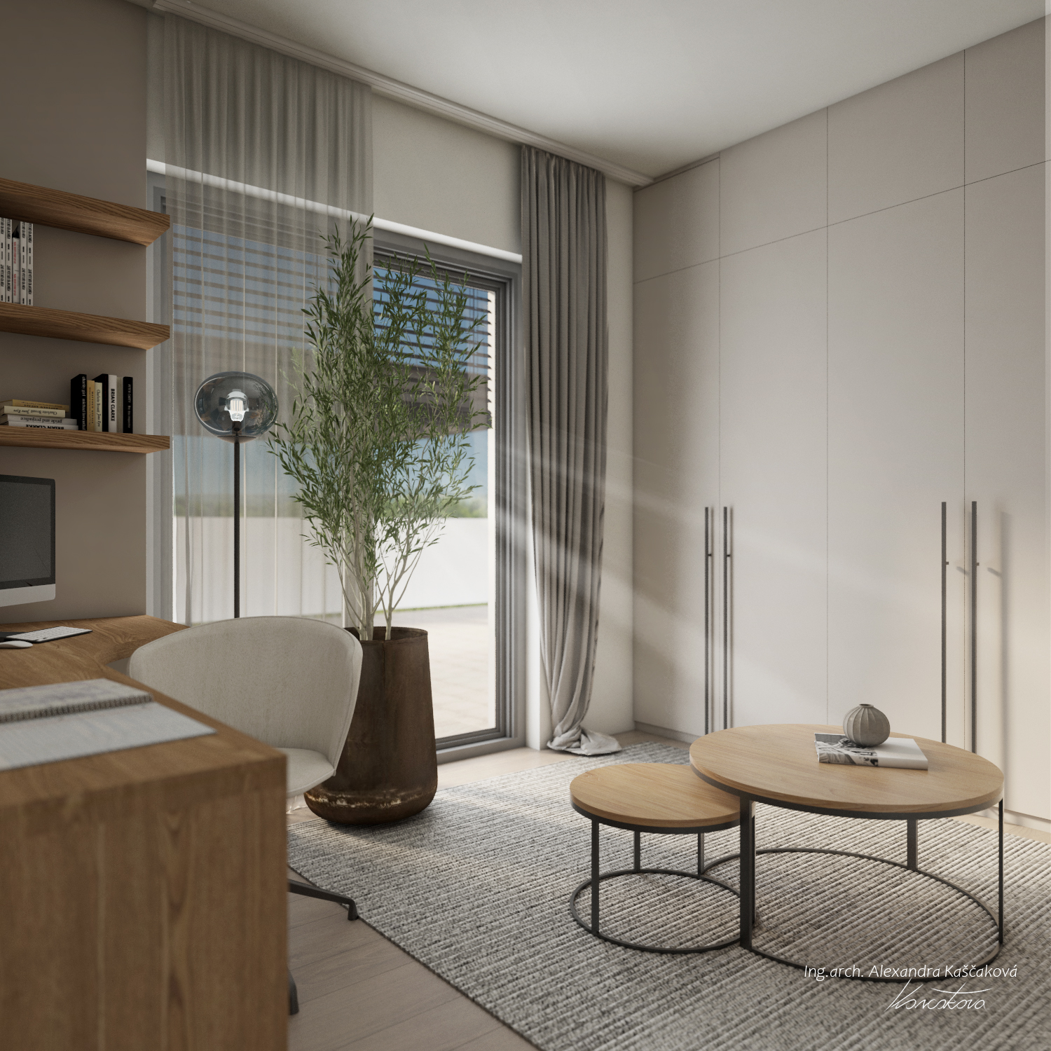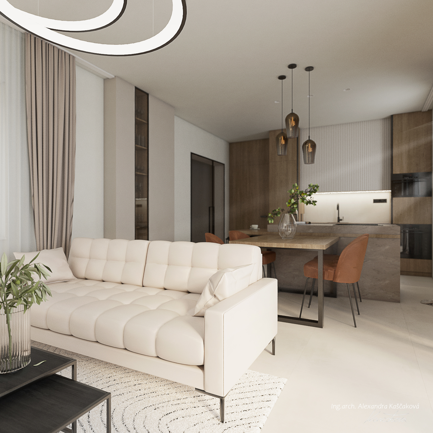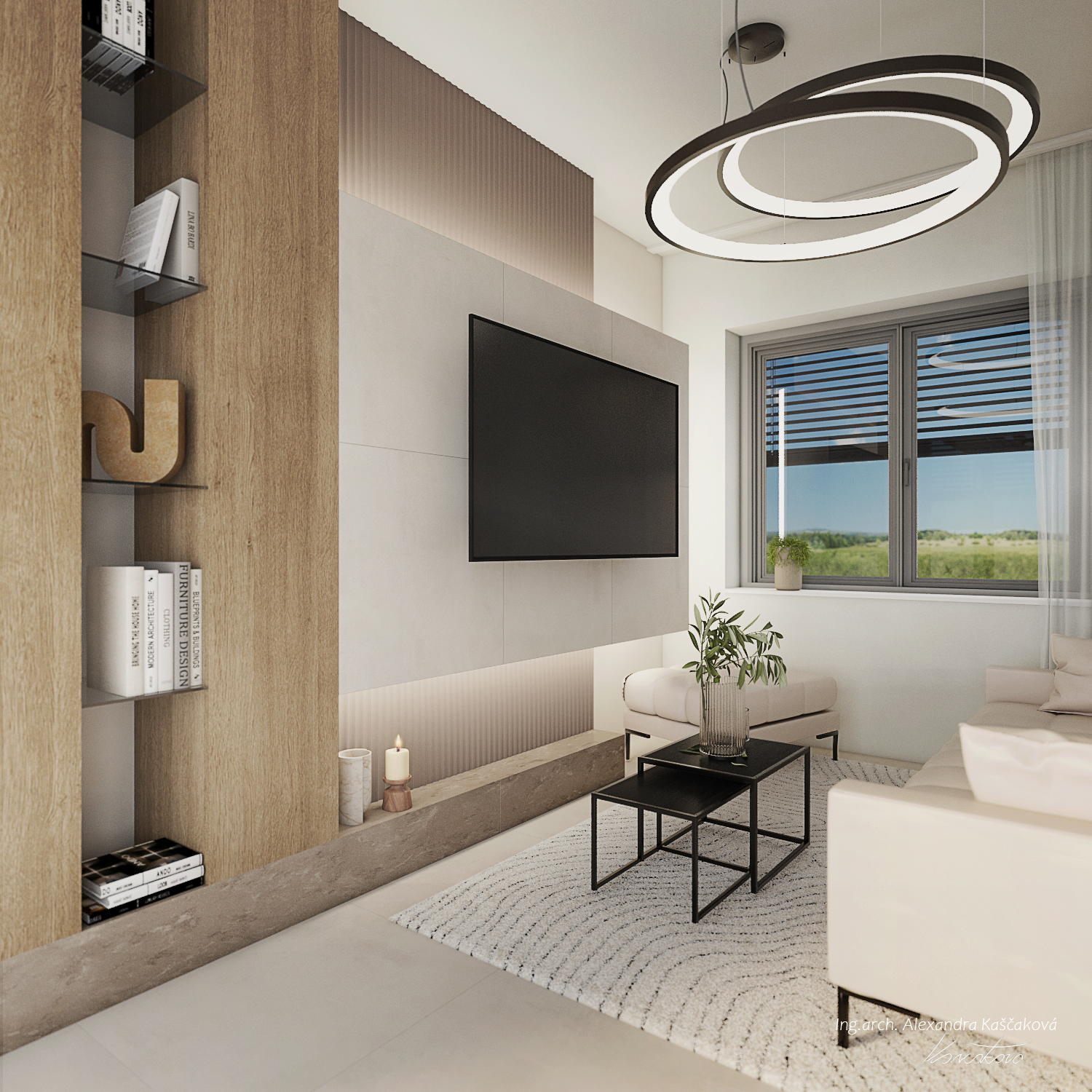 Návrh interiéru rodinného domu v Senomatech, řeší prostory o rozloze 96 m2. Jedná se tedy o menší domek, který jsme se s klientkou rozhodli pojmout v krémových a měděných tónech. Dlažba v decentní imitaci světlého betonu propojuje interiér od vstupní chodby až po samotný obytný prostor s kuchyní. Světlé podlahy v celém domě zdůrazňují textury a barvy, což vytváří kontrast, ale zároveň udržuje prostor vzdušný. Dominantním prvkem v obývacím prostoru je ostrůvek z corianu, ze kterého je vykonzolovaný jídelní stůl a barový pult v dřevodekoru. Prvek corianu můžeme najít i pod televizí nebo na chodbě, kde je zakomponovaný v nice skříně. V rámci celého interiéru pracujeme hodně s vertikálami, které se objevují za použití reliéfních obkladů za televizí, horními skříňkami v kuchyni nebo i v pracovně a na chodbě. Černé detaily dodávají interiéru akcent a kontrast.