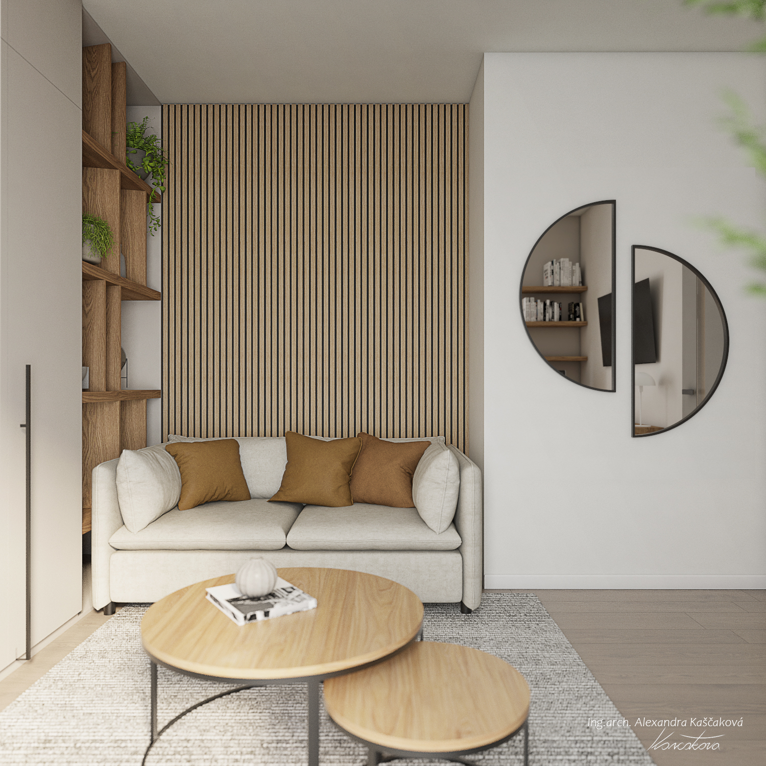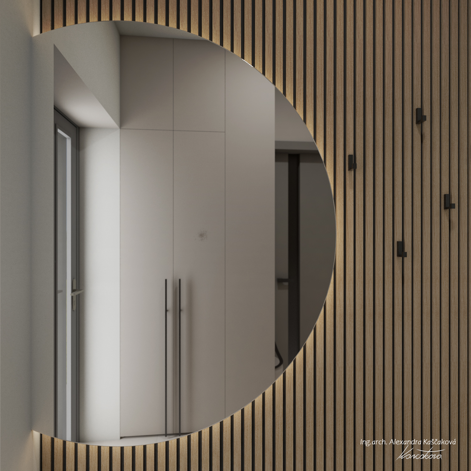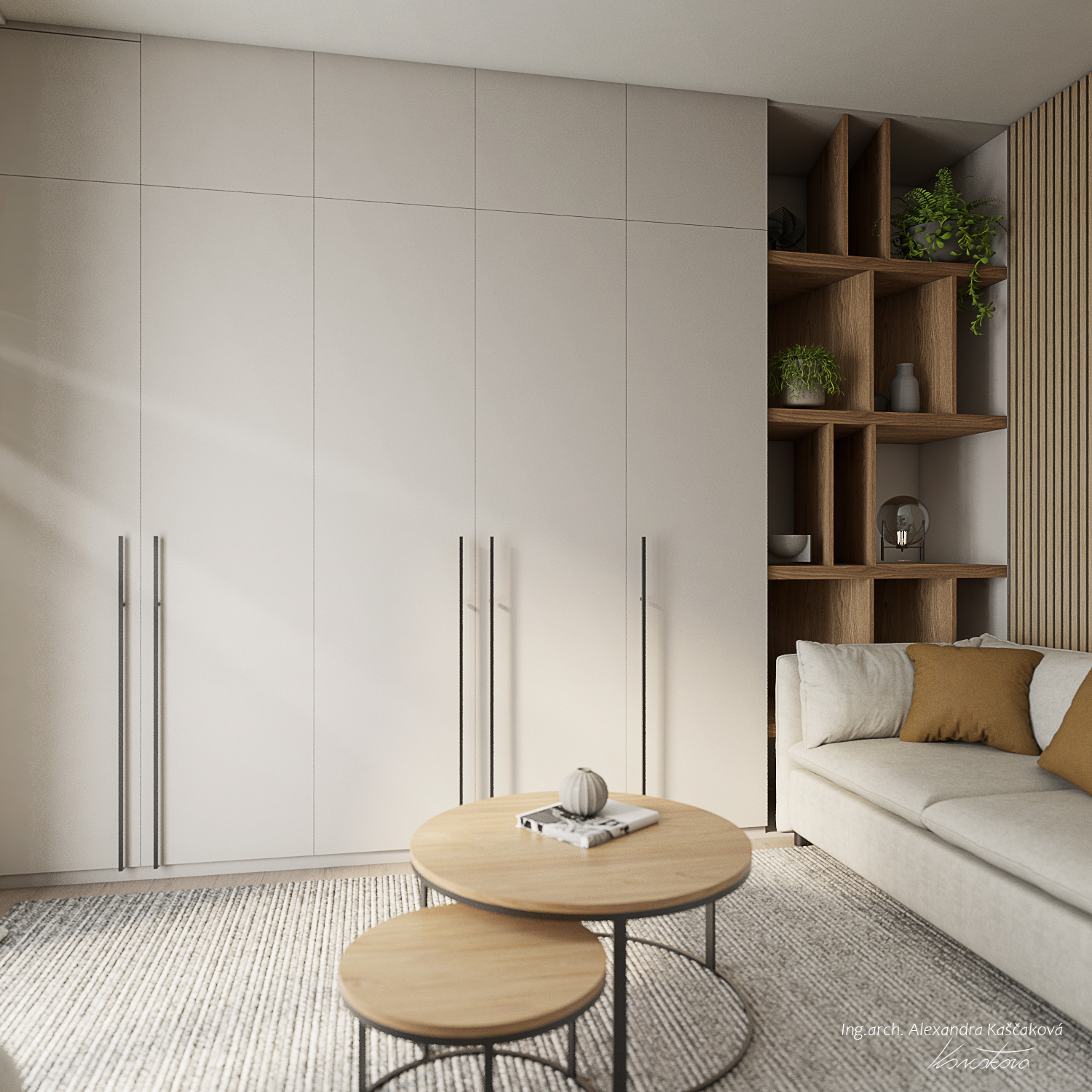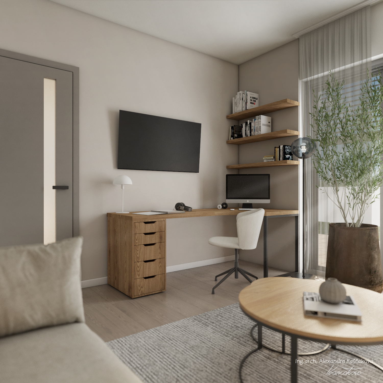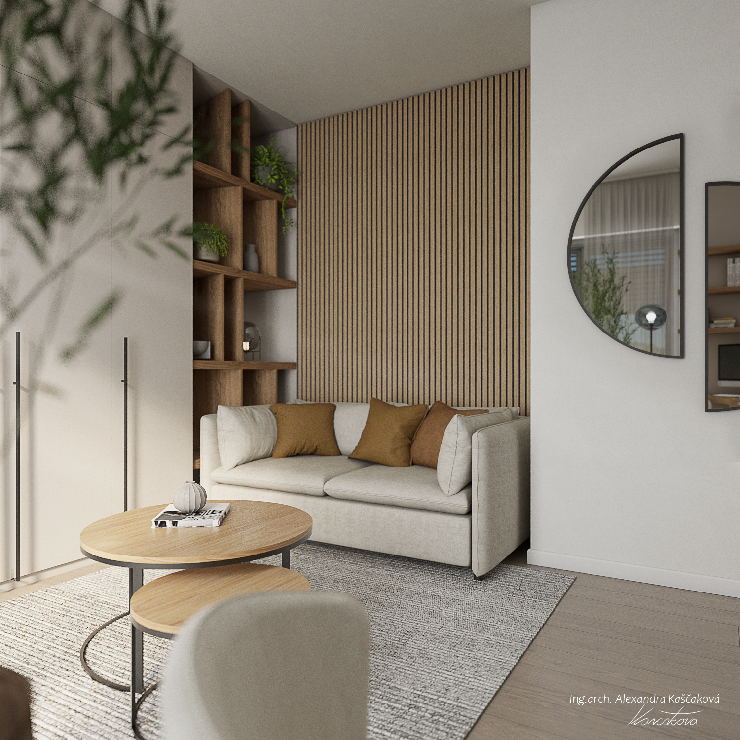 Návrh interiéru rodinného domu v Senomatech, řeší prostory o rozloze 96 m2. Jedná se tedy o menší domek, který jsme se s klientkou rozhodli pojmout v krémových a měděných tónech. Dlažba v decentní imitaci světlého betonu propojuje interiér od vstupní chodby až po samotný obytný prostor s kuchyní. Světlé podlahy v celém domě zdůrazňují textury a barvy, což vytváří kontrast, ale zároveň udržuje prostor vzdušný. Dominantním prvkem v obývacím prostoru je ostrůvek z corianu, ze kterého je vykonzolovaný jídelní stůl a barový pult v dřevodekoru. Prvek corianu můžeme najít i pod televizí nebo na chodbě, kde je zakomponovaný v nice skříně. V rámci celého interiéru pracujeme hodně s vertikálami, které se objevují za použití reliéfních obkladů za televizí, horními skříňkami v kuchyni nebo i v pracovně a na chodbě. Černé detaily dodávají interiéru akcent a kontrast.
